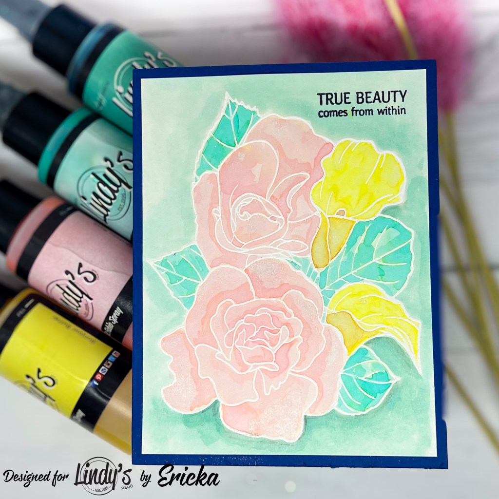 I love how versatile this spray and used it to paint up my flowers. I heat embossed the flowers with the Lindy’s Gang Wowzer White powder and started painting.