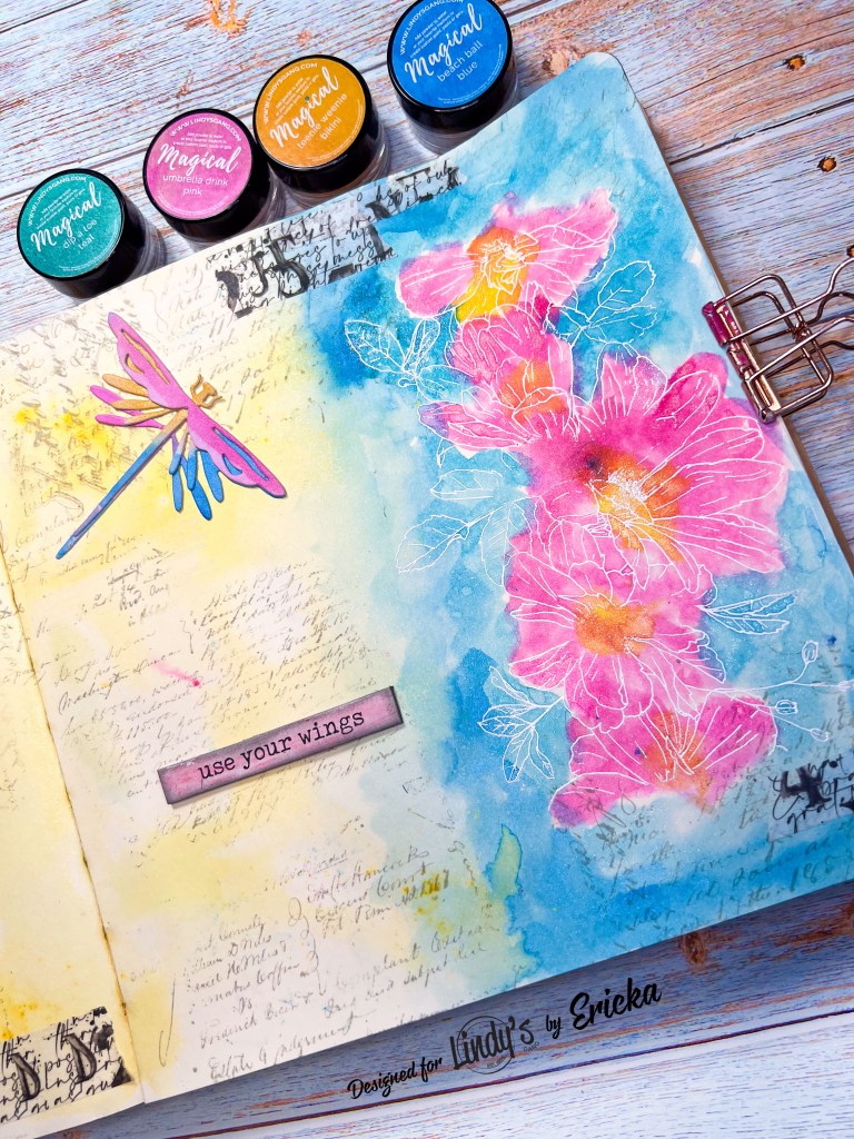 Hello friends and happy July! I hope you’re all enjoying a fabulous summer! With a new month comes a fresh Color Challenge over at the Lindy’s Gang Facebook page. This month, we’re diving into the vibrant hues of the Summer Break Magicals. These colors are absolutely stunning, and I was inspired to create a bright, summery journal page using some of my favorite Tim Holtz products.