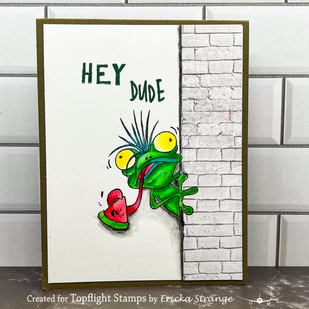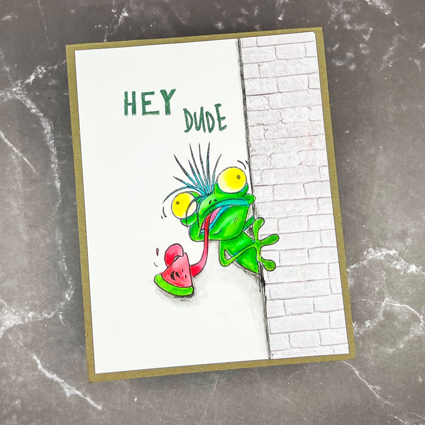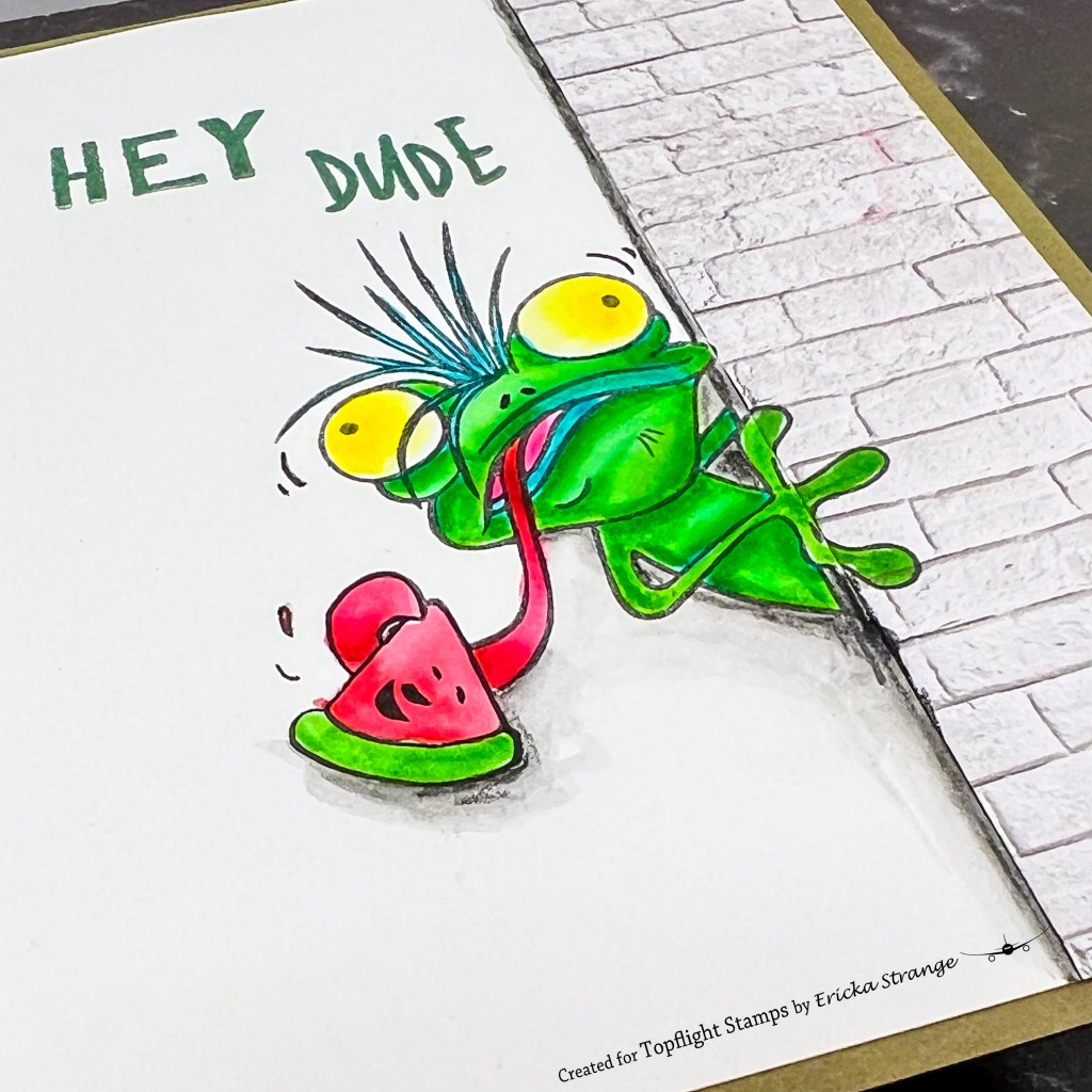 To begin, I adhered the patterned paper to the edge of my card, creating a clever illusion of a wall. This added a fantastic backdrop for my gecko friend. Next, I stamped the gecko image onto the card, positioning it just right to bring the scene to life. I used the Spectrum Noir Colorista Watercolor Markers to color this guy up and added some shading to give our little gecko a bit more dimension and character.