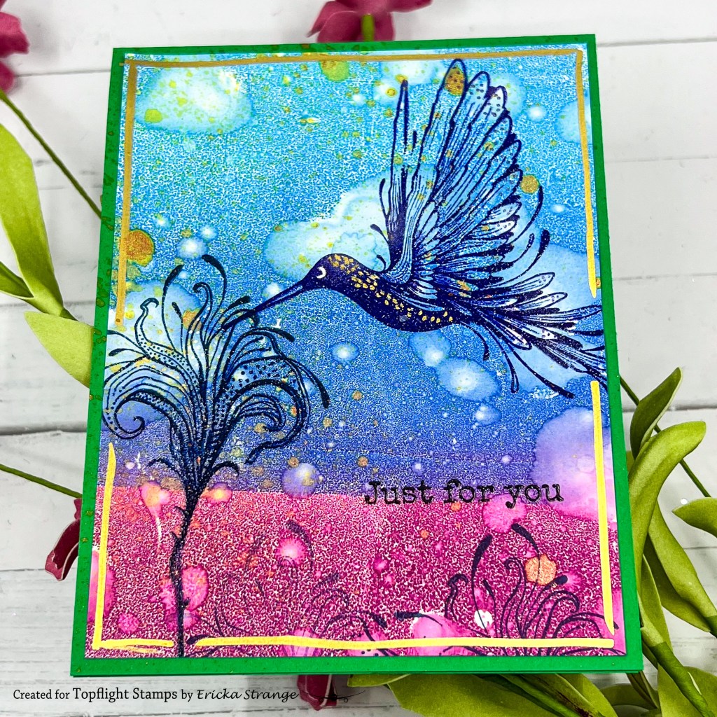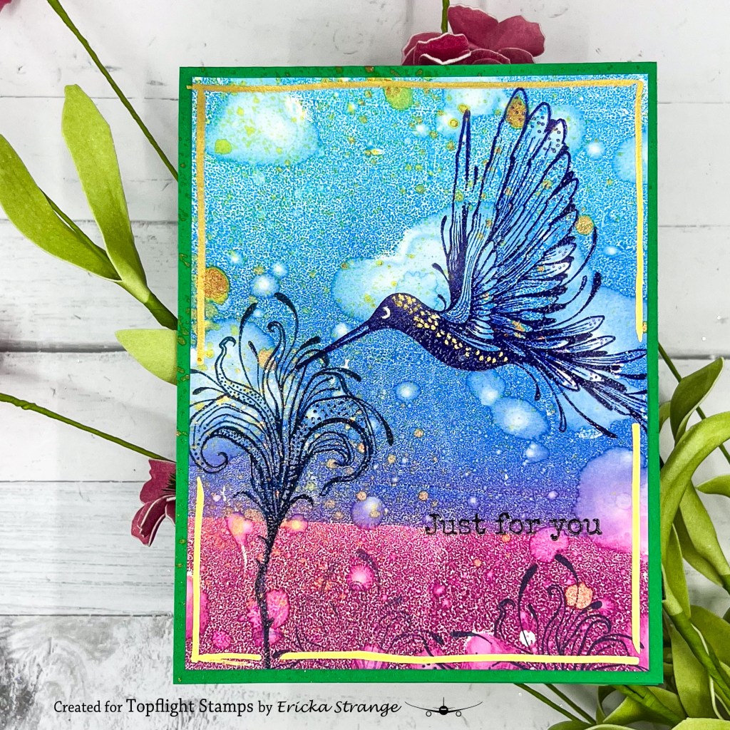To add a touch of elegance and shimmer, I highlighted the hummingbird with subtle strokes of gold. I also decided to frame the scene with a hand-drawn border using a Spectrum Noir pen. To finish off, I spritzed the card lightly to lift some ink, creating soft areas of light and shadow. For a final touch of summer magic, I sprayed the card with Lavinia Golden Temple Mystical Mist. This adds a delicate shimmer that catches the light, making the whole piece glow with a mystical aura.