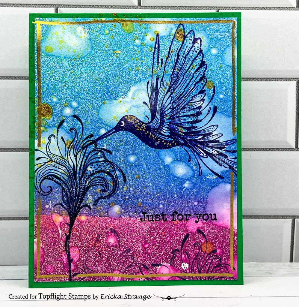 Once I lifted the print, I knew I had the perfect base for a whimsical scene. I stamped the delicate Lavinia Hummingbird and the elegant Divine 1 flower using Versafine Clair in Medieval Blue. The intricate details of these stamps really pop against the textured background, creating a harmonious balance between the bold colors and the intricate designs.