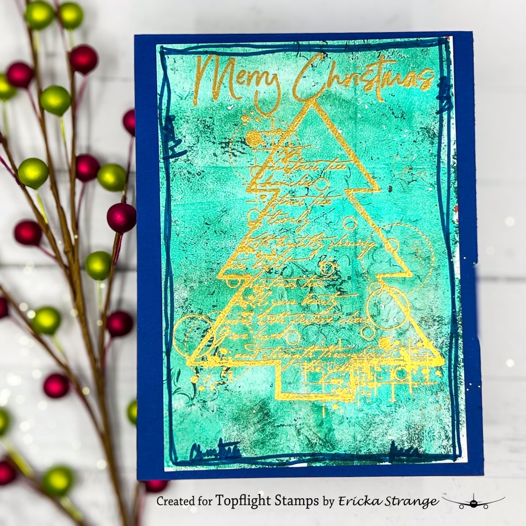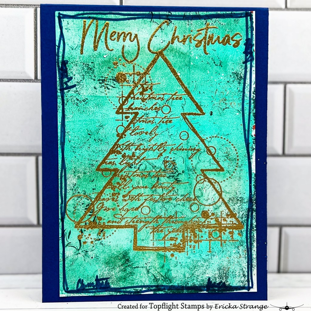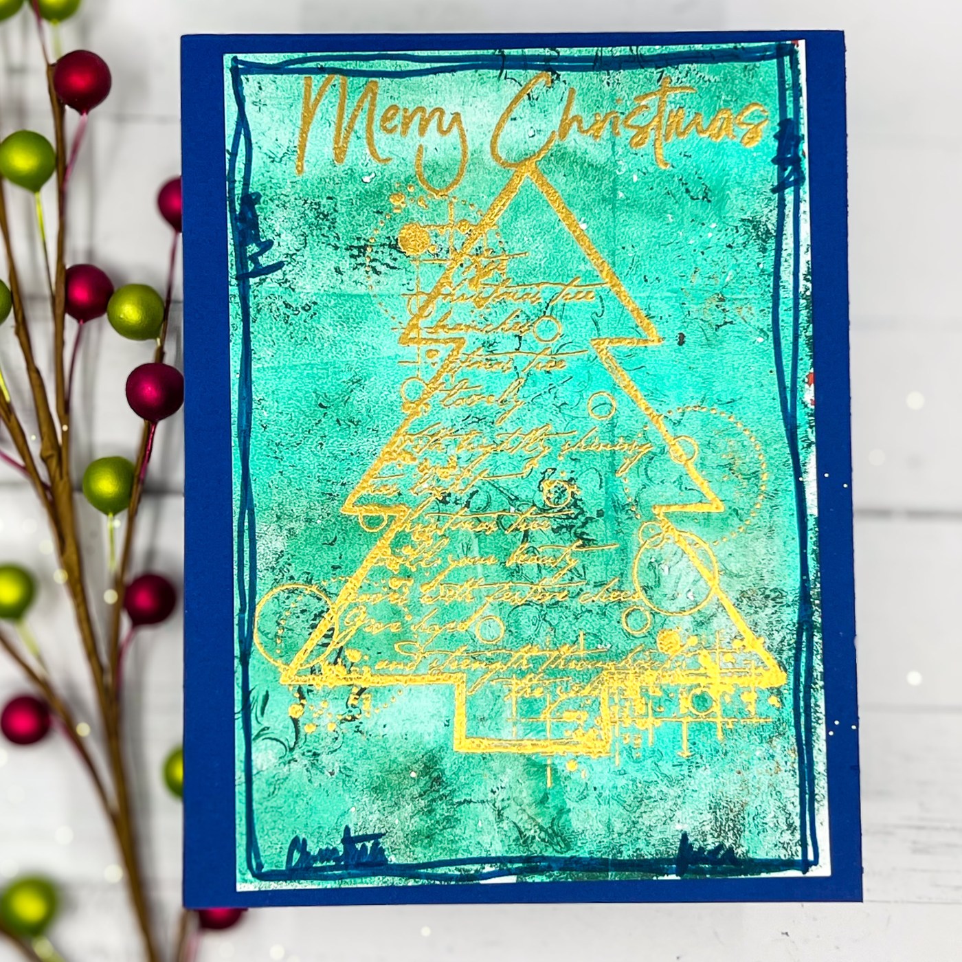 One of my favorite parts about creating gel press prints is that you’re never left empty-handed for future projects. This green print was just calling to be transformed into a Christmas tree! With a quick layer of that gorgeous gold embossing, I achieved a festive, grungy elegance without much effort. To finish off, I hand-drew a frame around the card to bring even more focus to the tree—simple but striking!