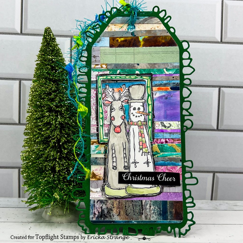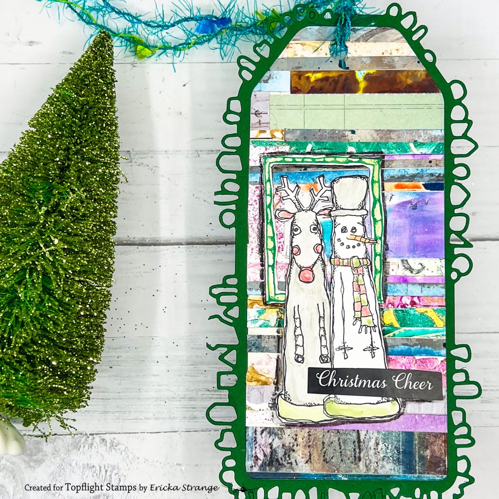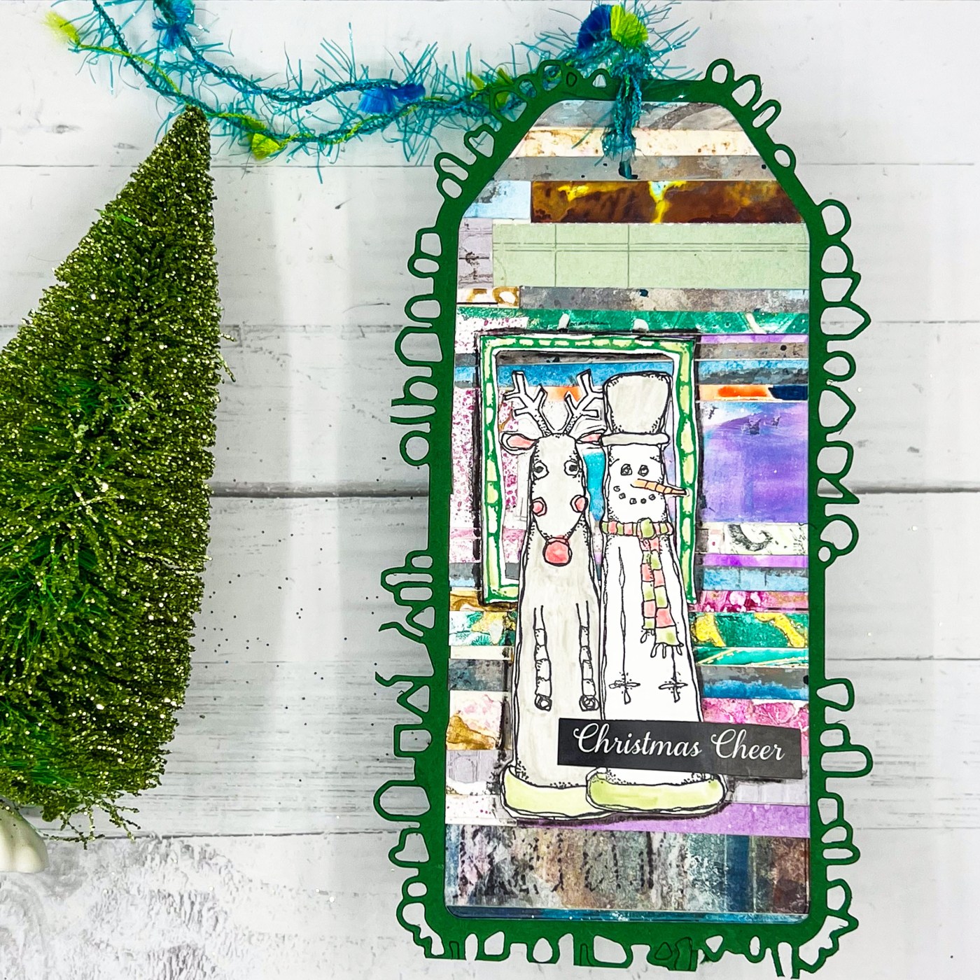Using Mattints in Greenstone, Ladybug, Ash, and Squeezed, I brought the reindeer and snowman to life. These paints add a muted tone to my busy background. Once dry, I carefully cut out the images and adhered them to my tag background, creating a fun and festive scene.