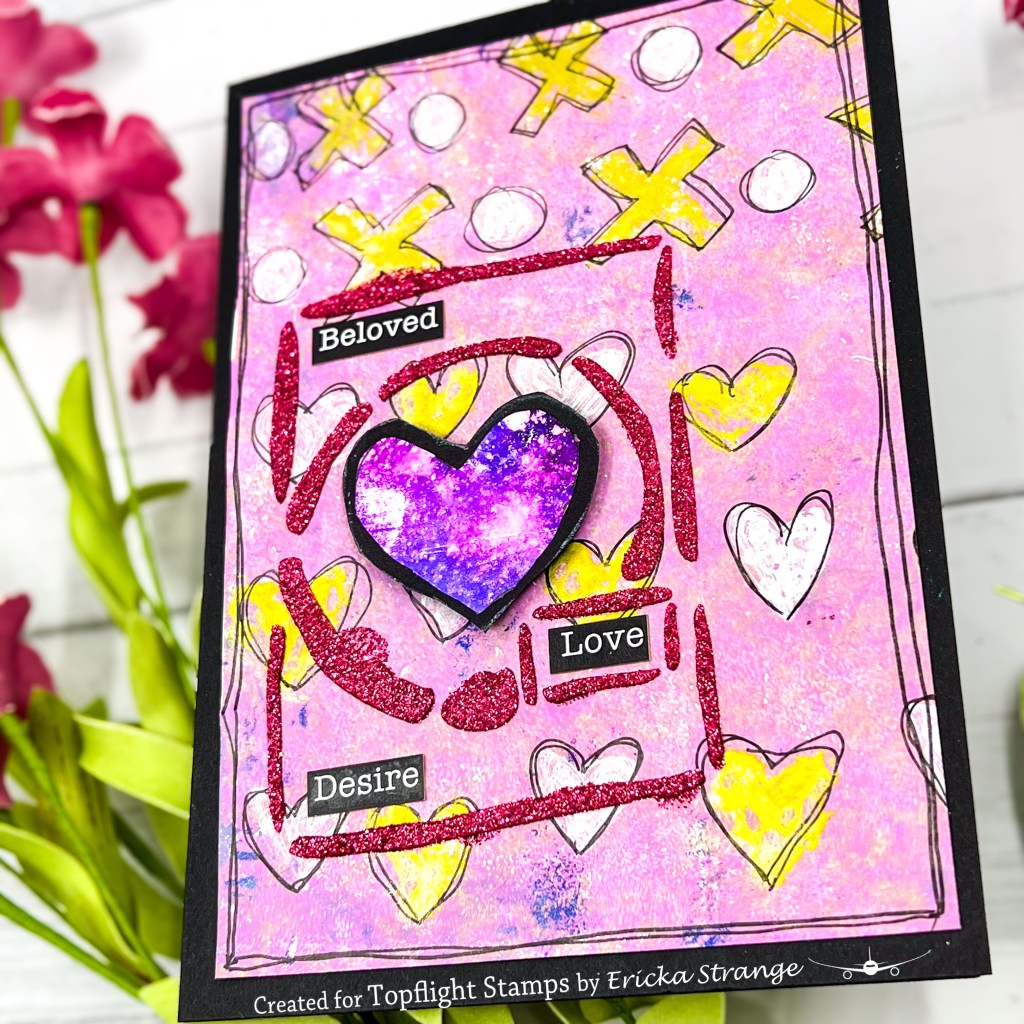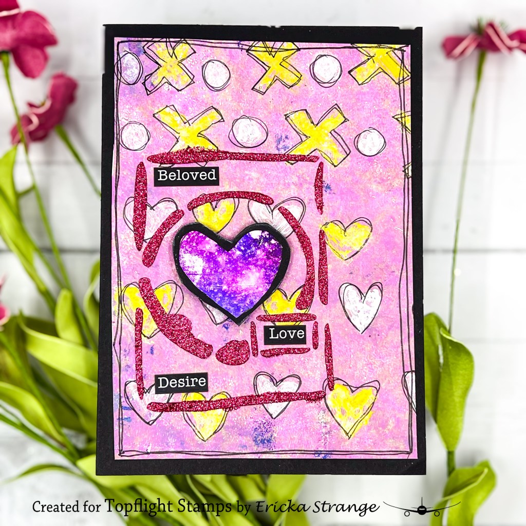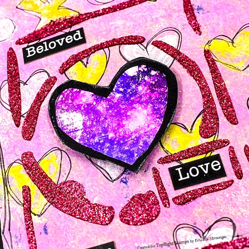 To make my card extra special, I used the PaperArtsy Frances Papillion PS377 stencil with Spectrum Noir Glitter Paste in Peony Bloom. The glittery heart shape added just the right touch of sparkle to my design. Once the paste was dry, I traced the heart onto a spare gel press scrap and mounted it on black cardstock to create a bold, eye-catching element.