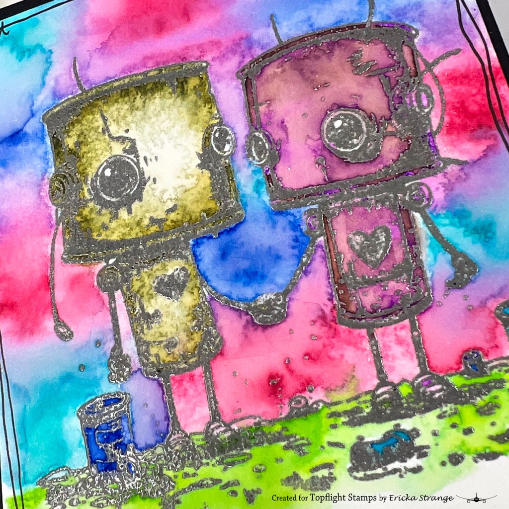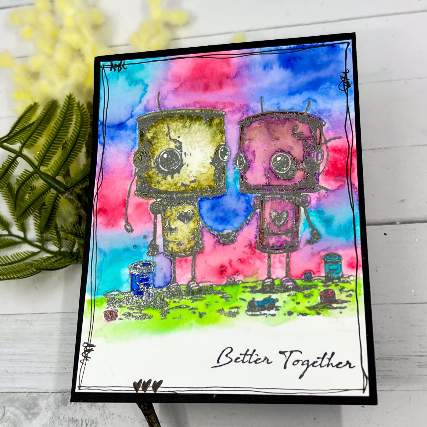 For this card, I started by stamping the robot image using Versafine Clair Morning Mist ink and clear embossing it to give it a crisp, polished look. To bring the scene to life, I turned to my Spectrum Noir Watercolor Markers. I wanted the robots to have a rustic and weathered vibe, so I used darker tones and blended brown into the purple to mimic a rusty finish.