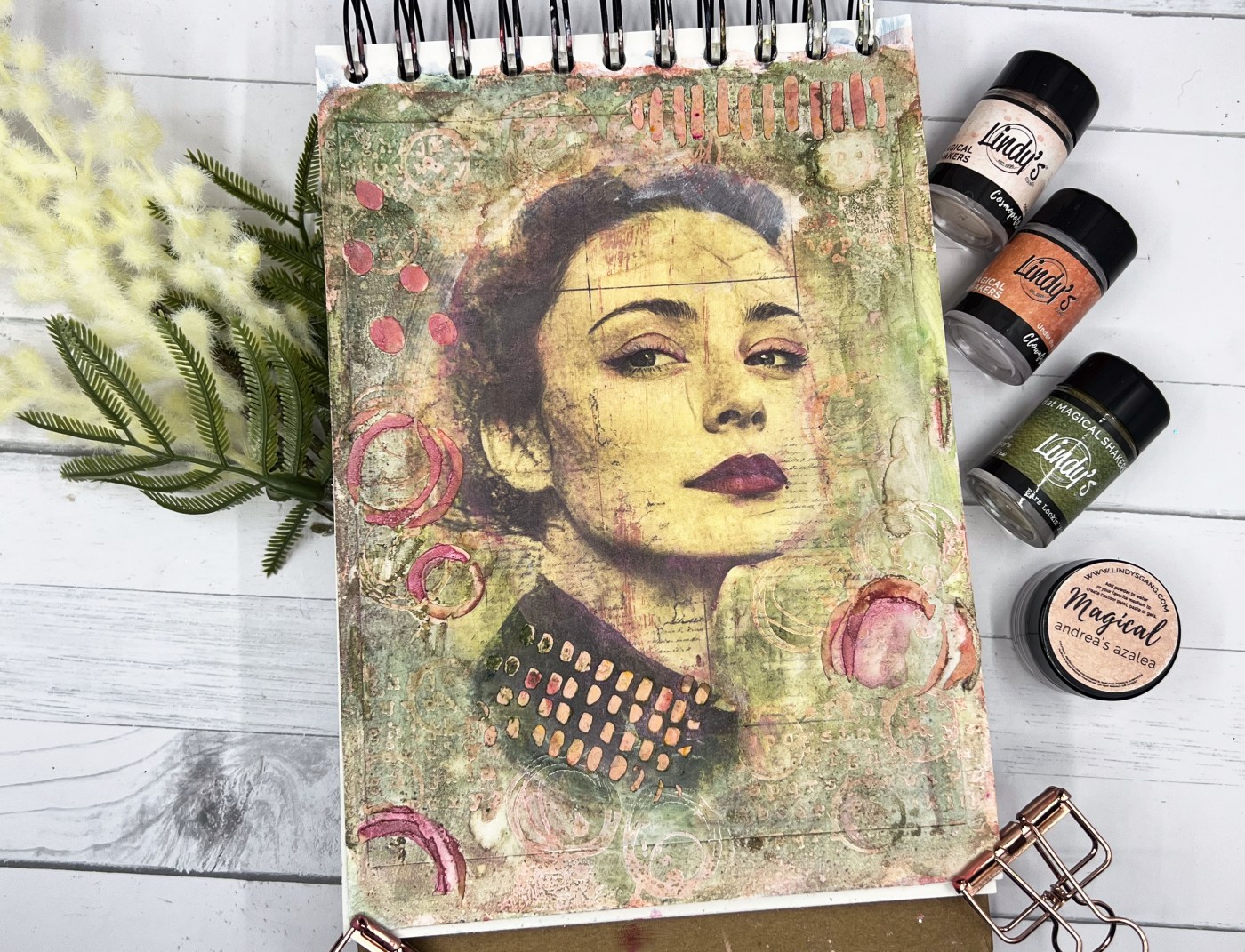 I began by adhering the print to my journal and prepping the surface with clear and white gesso, ensuring a smooth base for layering color. Since my printer gave the image a slightly yellow tone, I painted over it with Clownfish Coral to warm it up and bring out richer hues. Around the image, I blended Cosmopolitan Pink, while Ears Lookin’ ‘Atcha Olive added subtle depth to her eyes and clothing, enhancing the vintage aesthetic.