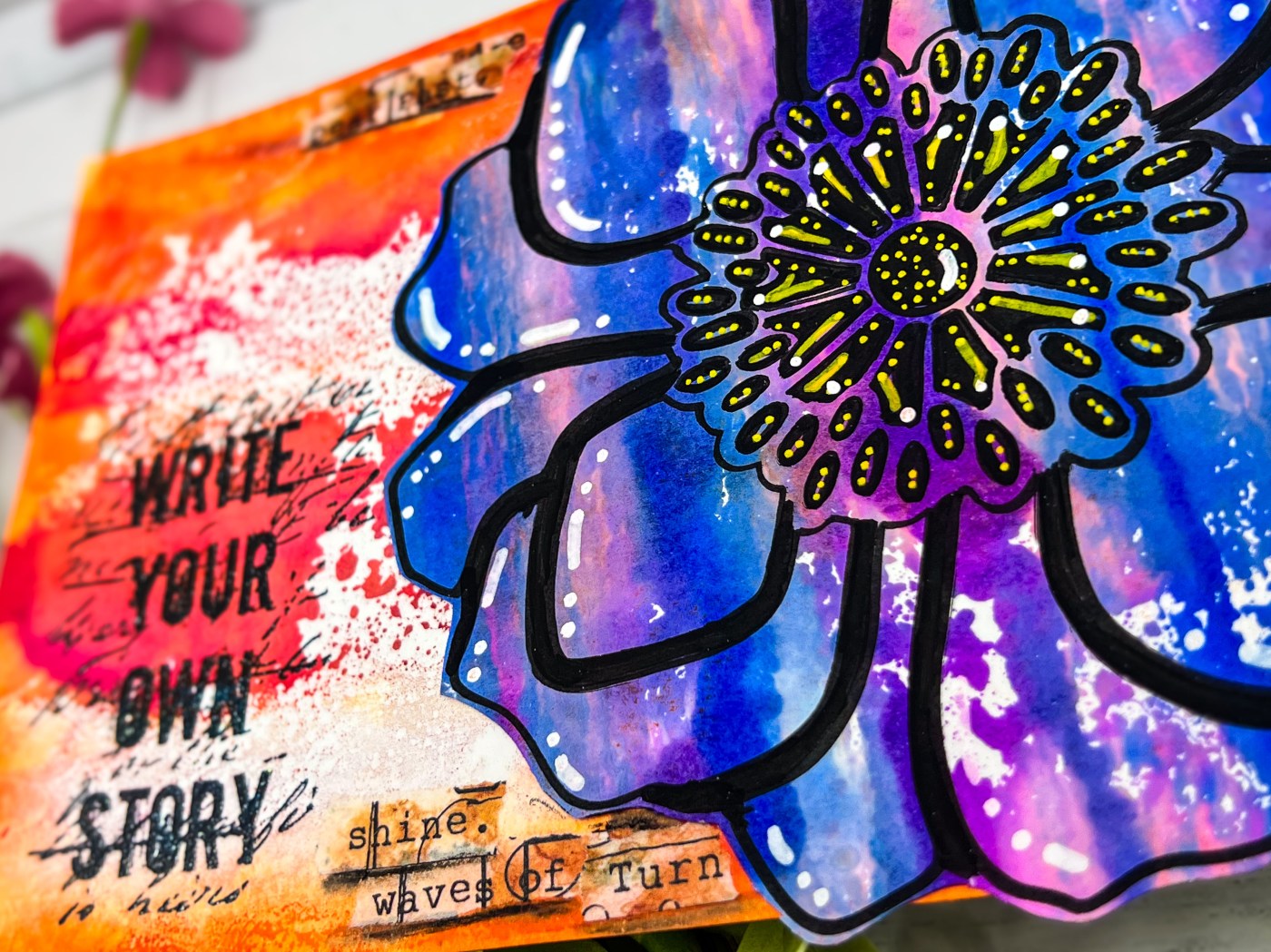 I began with a cool blue background and used the PaperArtsy Tracy Scott PS463 stencil to trace a big bloom using an acrylic pen. Once outlined, I added black shading and detailed it with yellow and white highlights. Then I cut it out to layer later.