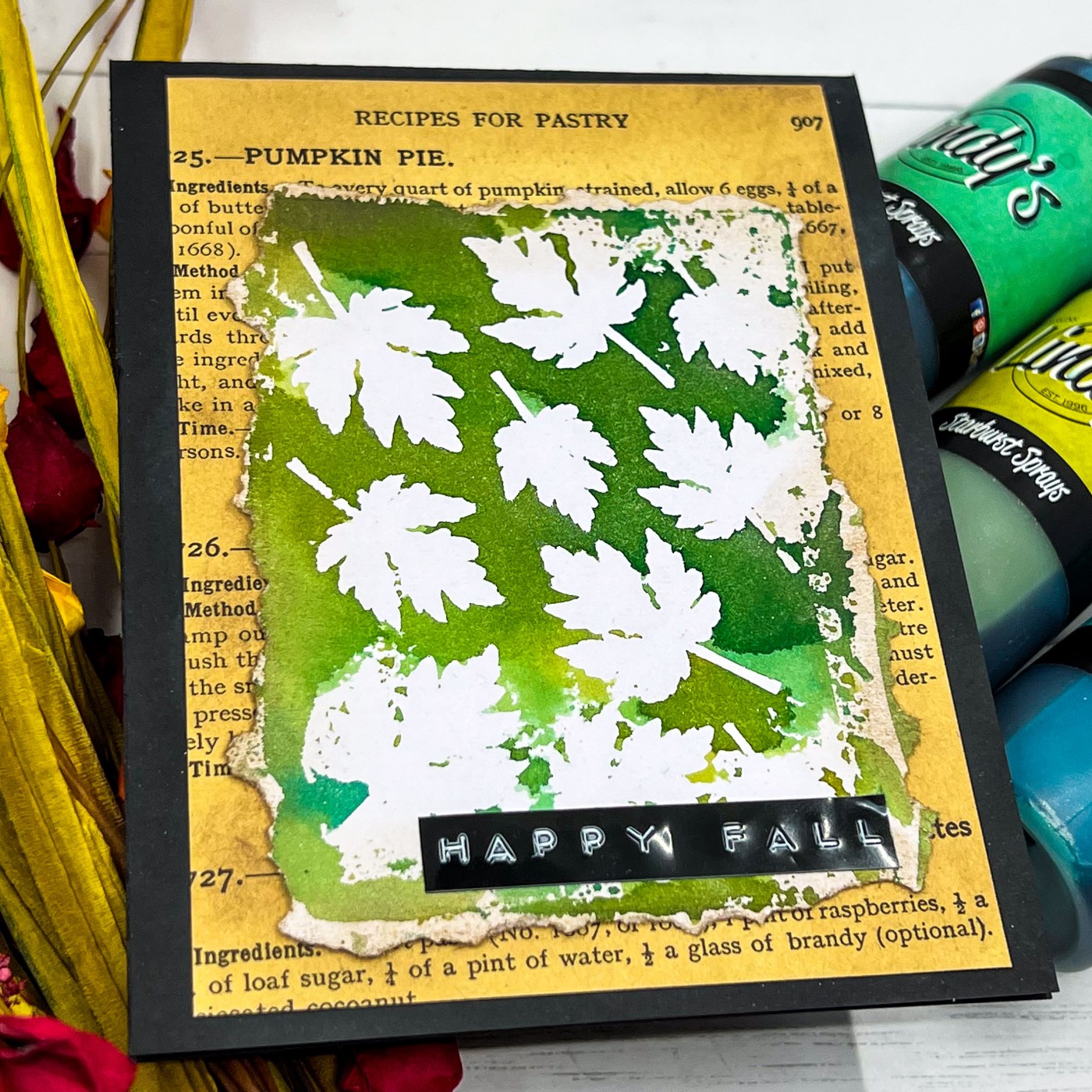 - Background magic: I started with watercolor paper and sprayed Lindy’s Rusty Lantern Lime, Shabby Turbine Teal, and Time Travel Teal through the Mini Maple Leaves stencil. These shades layered beautifully for that earthy yet vibrant fall feel.