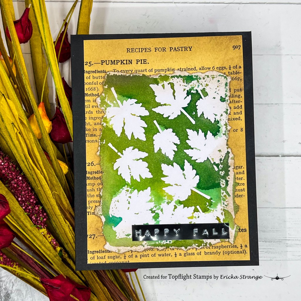 - Vintage layer: Once my background was dry, I carefully tore the edges for texture and adhered it to a vintage book page. (And would you believe it—the page had a pumpkin pie recipe on it? Couldn’t have been more perfect for a fall card!)