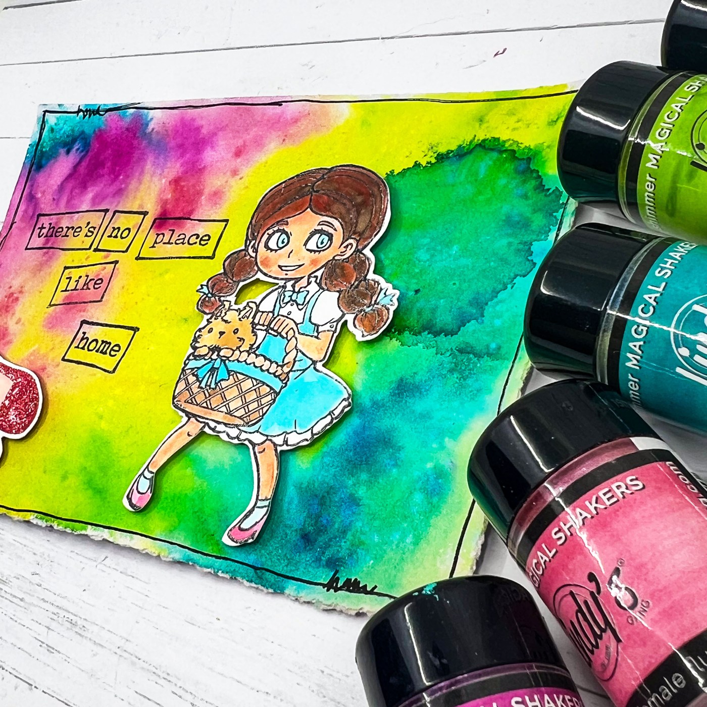 For Dorothy herself, I kept the rainbow theme going—watercoloring her dress with the same Shimmer Magicals and adding a touch of warm brown for her hair. I love how the shakers tie everything together with their shimmer and depth.