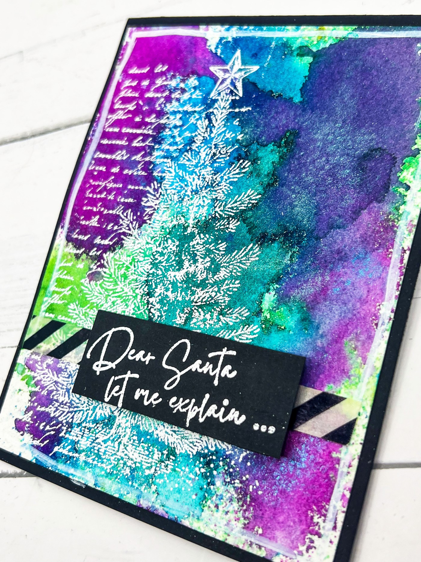 To finish, I stamped the sentiment on black cardstock, added a strip of washi tape for a pop of pattern, and mounted everything with a crisp white border. Just like that, another Christmas card ready for the pile — easy, shimmery, and festive!