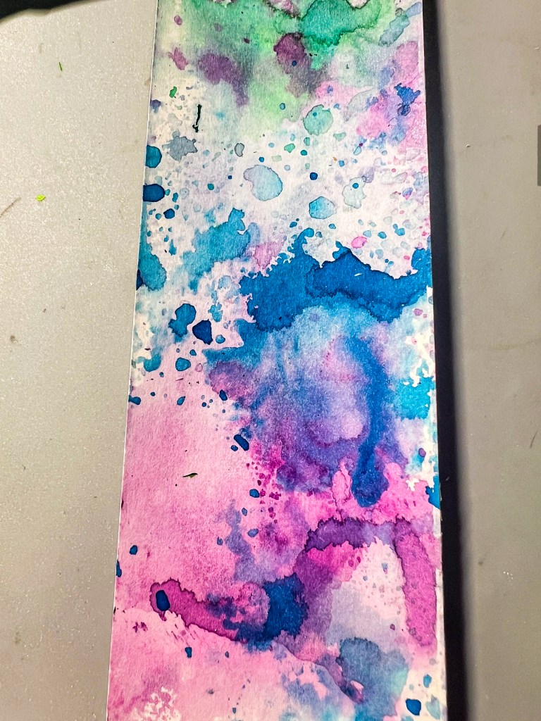 After spraying, I pressed a second sheet of watercolor paper into the overspray. It picked up the extra color and gave me a coordinating background for each tag.
