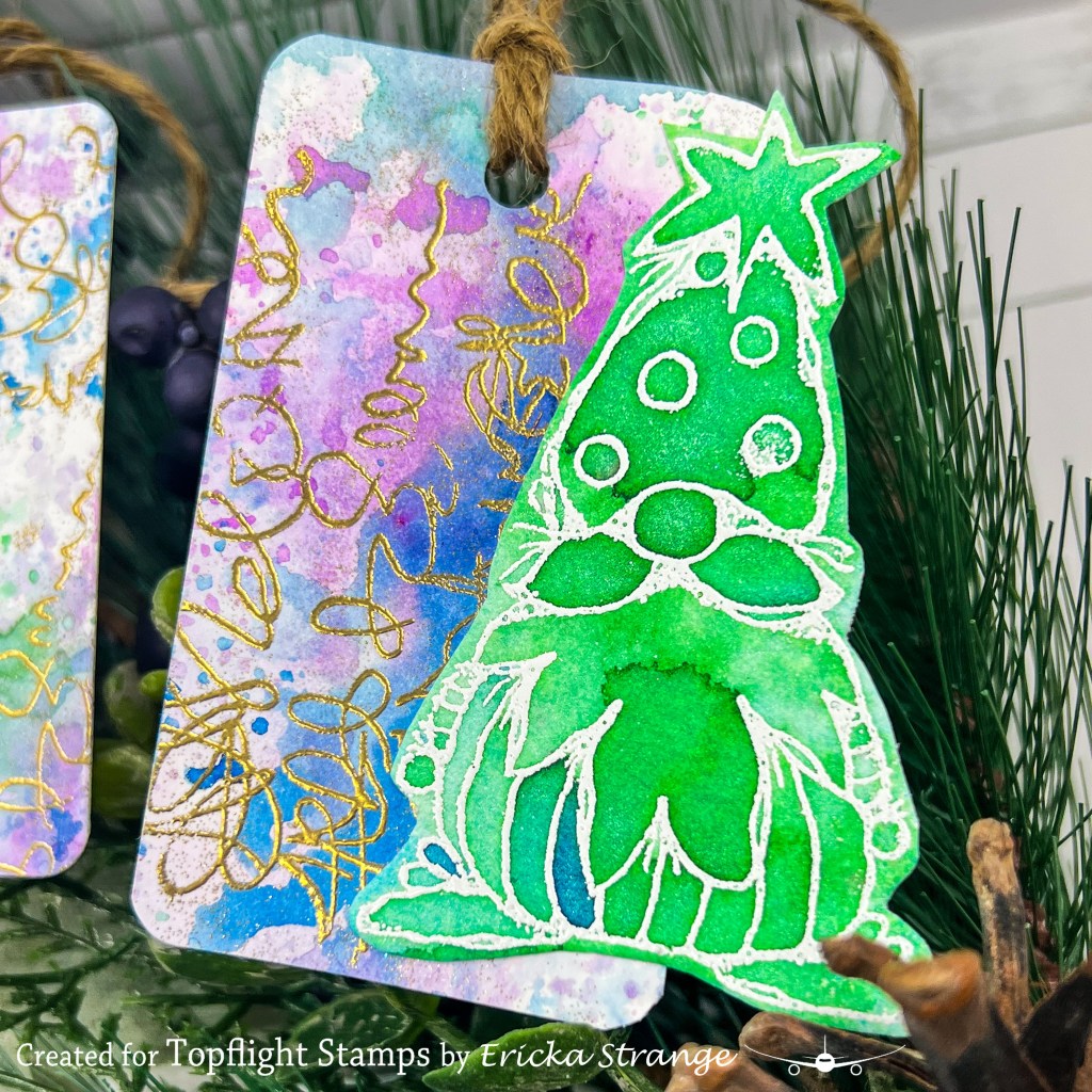 Once the backgrounds were dry, I added texture with the PaperArtsy Tracy Scott Mini 33 stamp and a touch of gold embossing. From there, it was simple. I attached the gnomes, punched a hole at the top, and finished each piece as a quick, colorful gift tag ready for Christmas wrapping.