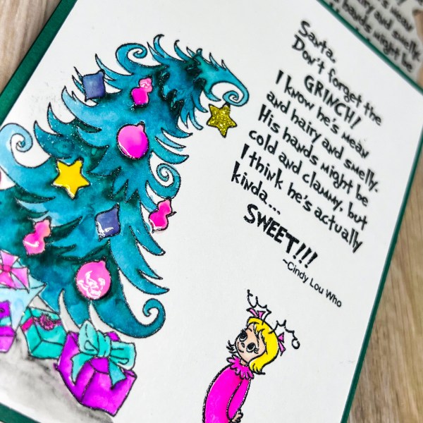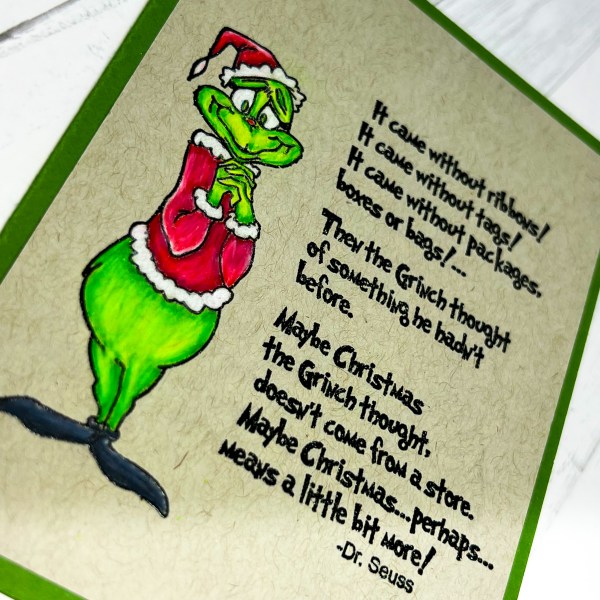 Hello friends! Today I am playing with another Grinch stamp from Crackerbox Stamps. card because you can never have too many Christmas cards. I love al these wonderful Grinch stamps and love that I get to use them all season long. Today, I used my colored pencils to color up the Grinch Head Image after... Continue Reading →