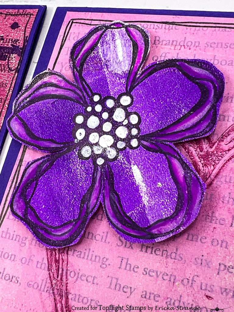 For embellishments, I turned to my stash, cutting out flowers from a previous gel press print and stamping the PaperArtsy Tracy Scott 58 floral design on them. I highlighted the centers with a white pen and added colored pencil for dimension.
