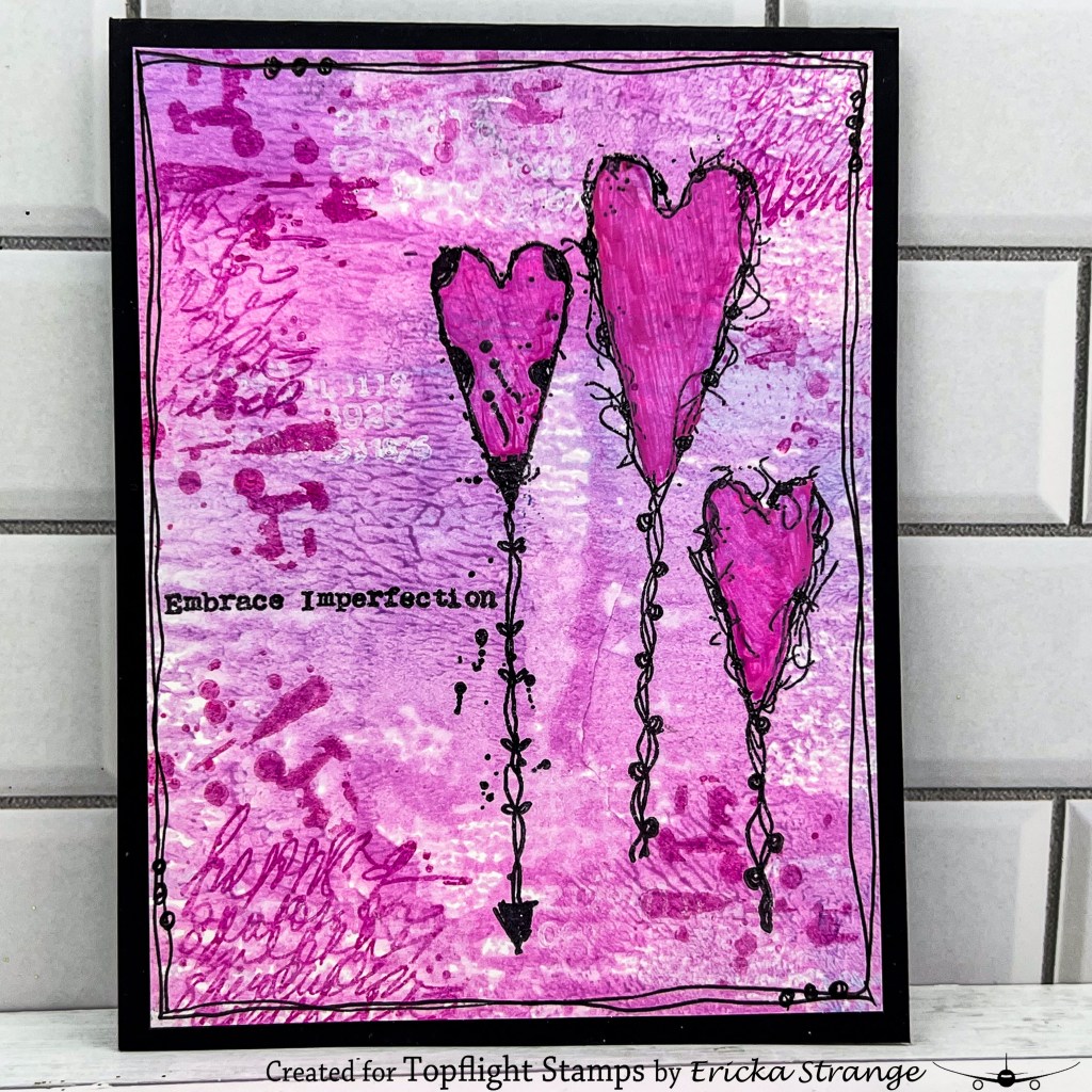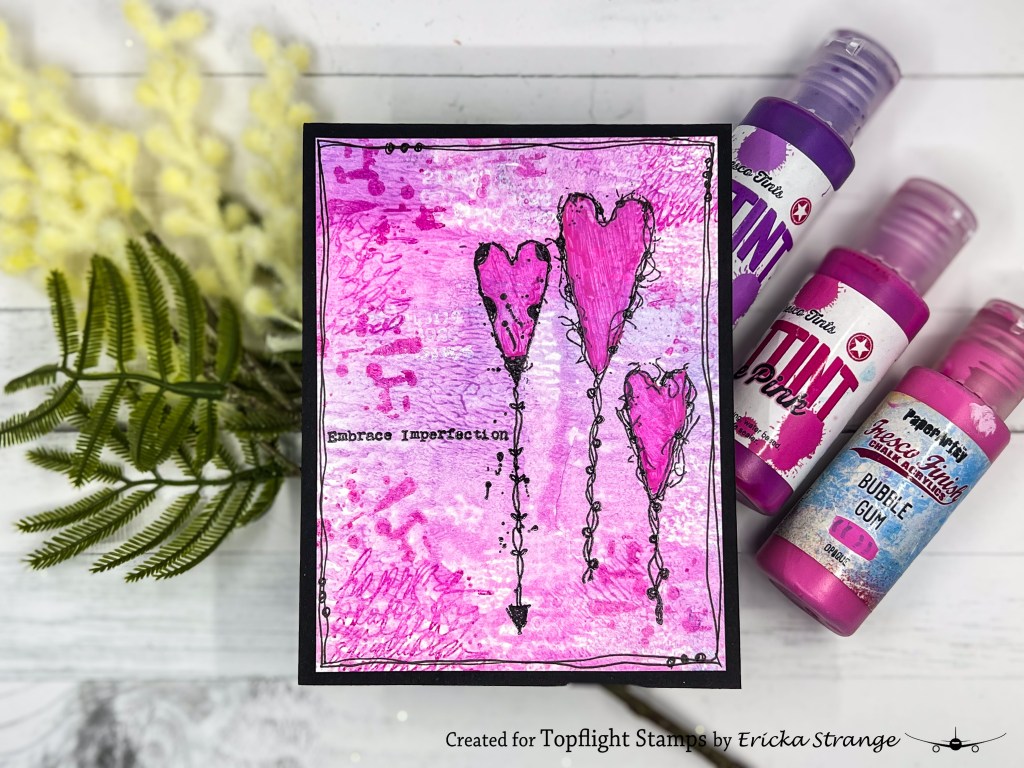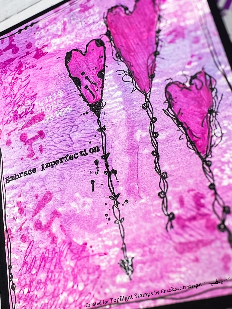 After pulling my print, I added a bold touch using the AALL & Create Hearts stamp with VersaFine Clair Nocturne ink, heat embossing it for extra dimension and shine. To enhance the background even further, I stamped with an older AALL & Create set, similar to the Visual Dream set, in VersaFine Clair Charming Pink—adding layers of dreamy texture. I used the PaperArtsy Fresco Paints in Bubble Gum to add color to my hearts.
