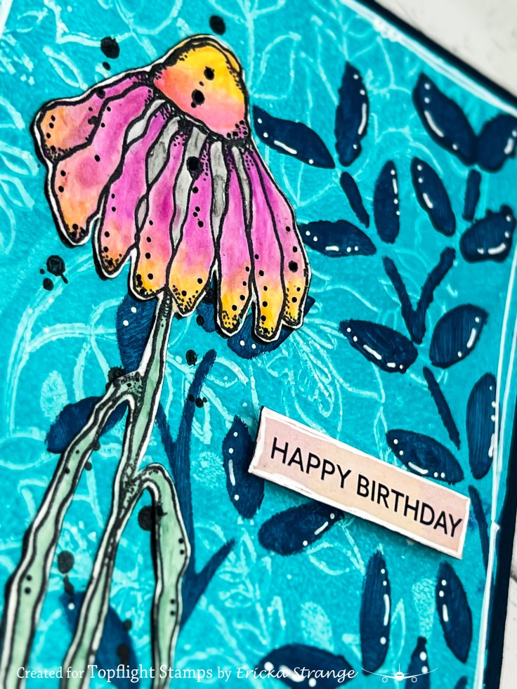 Once the flower dried, I fussy cut it out and stamped the same image directly onto my background. This little trick lets me keep all the beautiful stamped details underneath while making the cut image really pop!