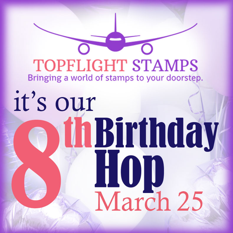 It’s Topflight Stamps 8th birthday and to celebrate, I’ve teamed up with some great designers to showcase celebratory projects using the unique products available at Topflight Stamps. Please hop along with us and see all the beautiful talent from this group of amazing designers! There is a master list of Hop stops on the Topflight Stamps blog! We are also Hopping on Instagram! You can start at the Topflight Stamps account @topflightstamps .