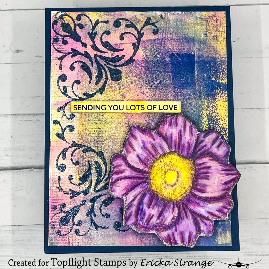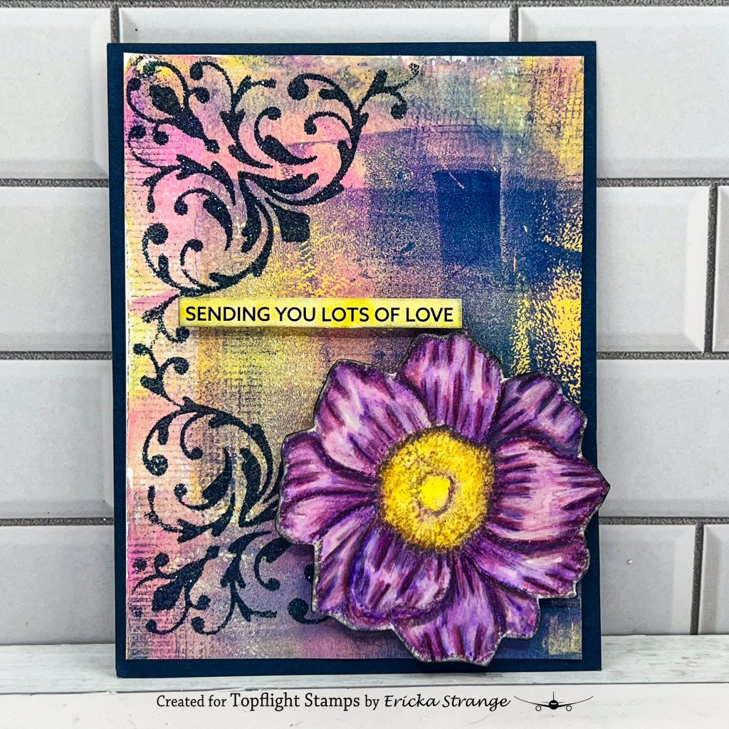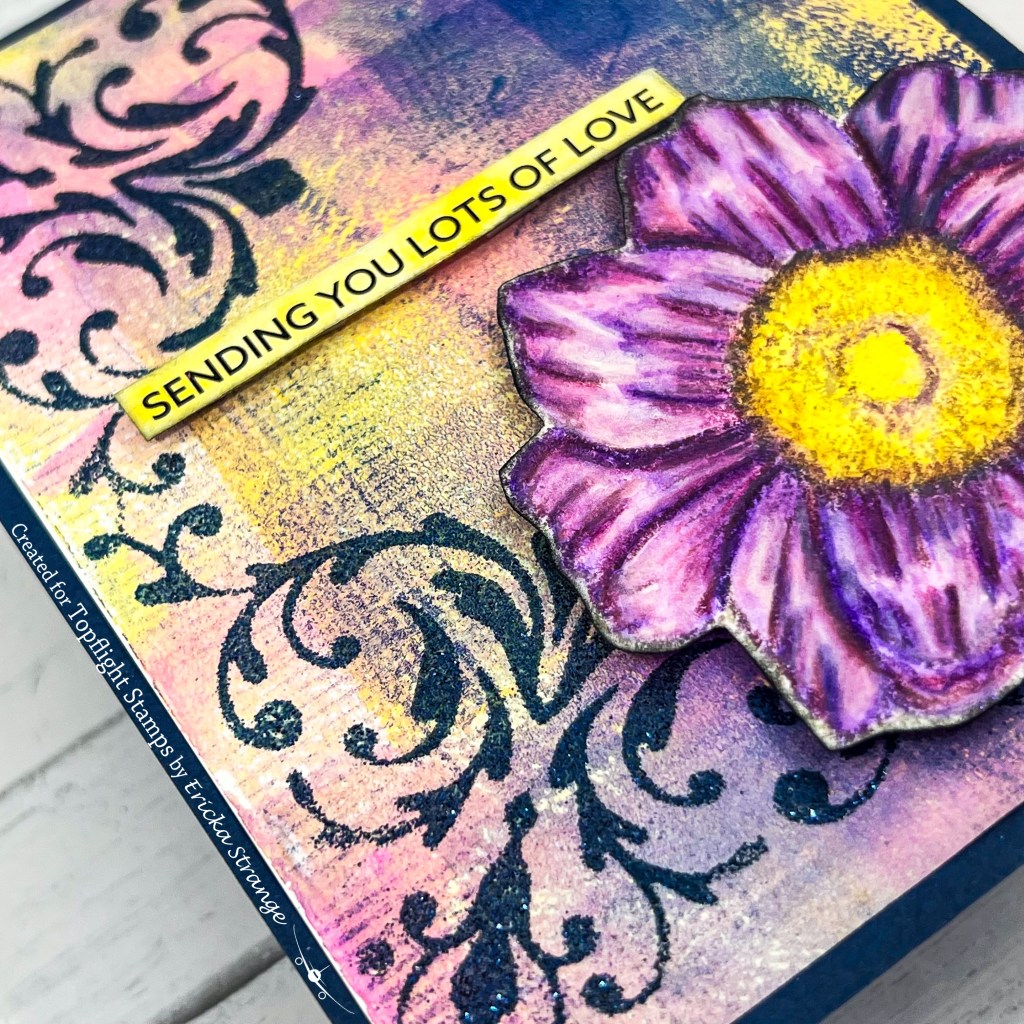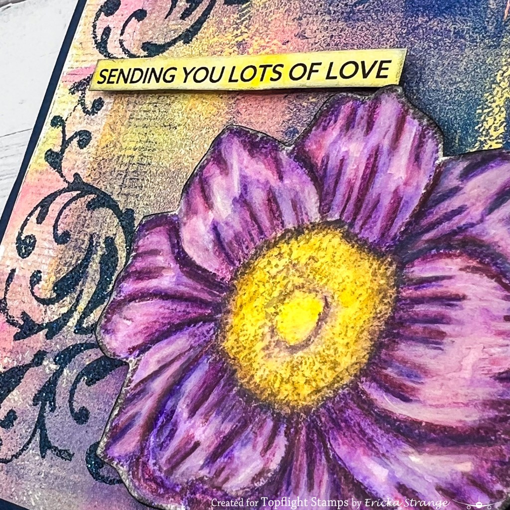 For my focal point, I stamped one of Tracy Scott’s gorgeous blooms in gray on watercolor paper. I played around with my watercolor pencils (still learning!) and layered in depth and contrast using my trusty colored pencils. After fussy cutting the flower, I popped it up with foam tape for a bit of lift.