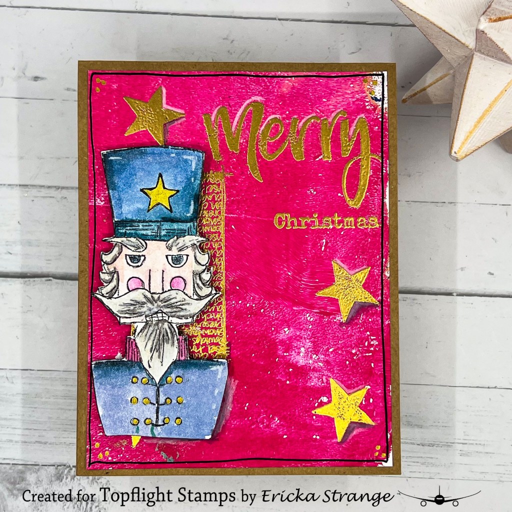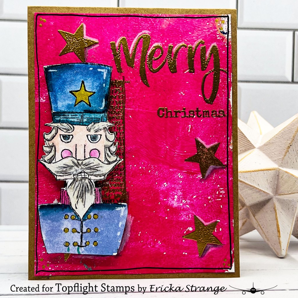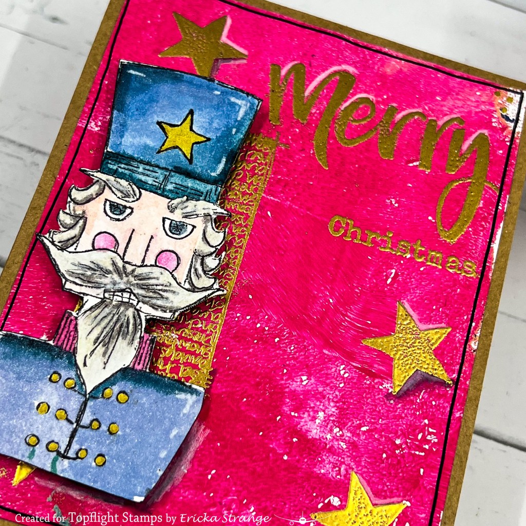 On a separate piece of watercolor paper, I stamped this charming nutcracker image and brought him to life with watercolors in classic holiday tones. Once he was dry, I fussy cut him out and added him to the background for a dimensional touch. He’s regal, festive, and just a bit quirky, just how I like my holiday icons!