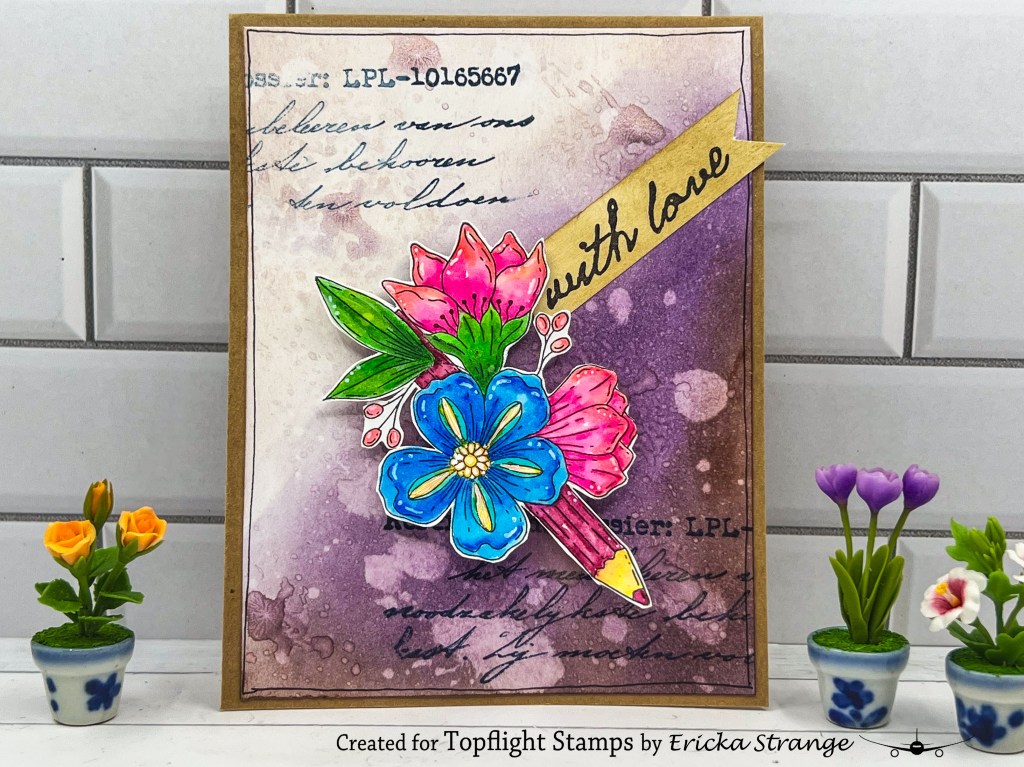 To kick things off, I dusted off my Karin Brushmarkers (literally it’s been a minute!) and got to work. I stamped the sweet floral image using Versafine Clair Nocturne ink and watercolored it with my markers. These brushmarkers blend like a dream and brought the whimsical blooms to life with soft, juicy color.