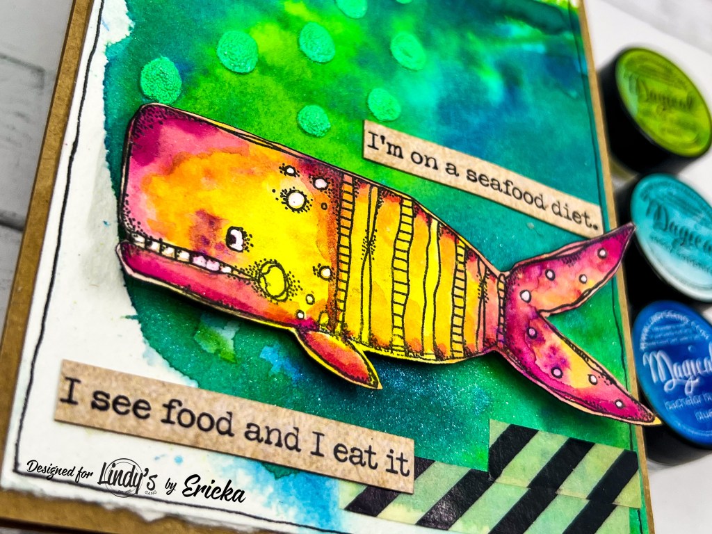 Once the background dried, I brought in the Kate Crane 003 set. I absolutely love Kate’s quirky, fun designs—they bring instant character and energy to any piece. I stamped the bold image in Versafine Clair Nocturne to make sure it stood out against all the layered color.