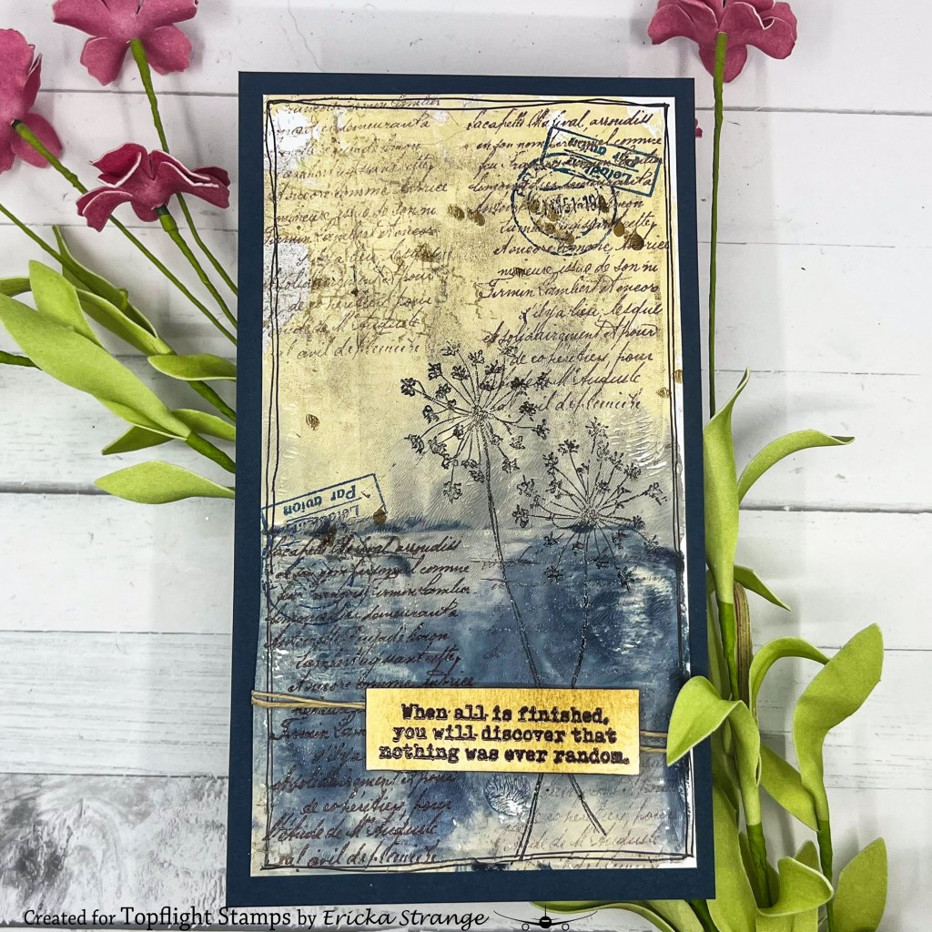 For stamping, I reached for one of my all-time favorite nature sets: Alison Bomber 41 – Pressed Umbels by PaperArtsy. I paired it with my trusty Ink & the Dog Mini Script stamp for those subtle background details.