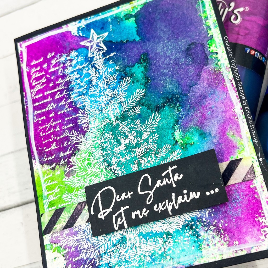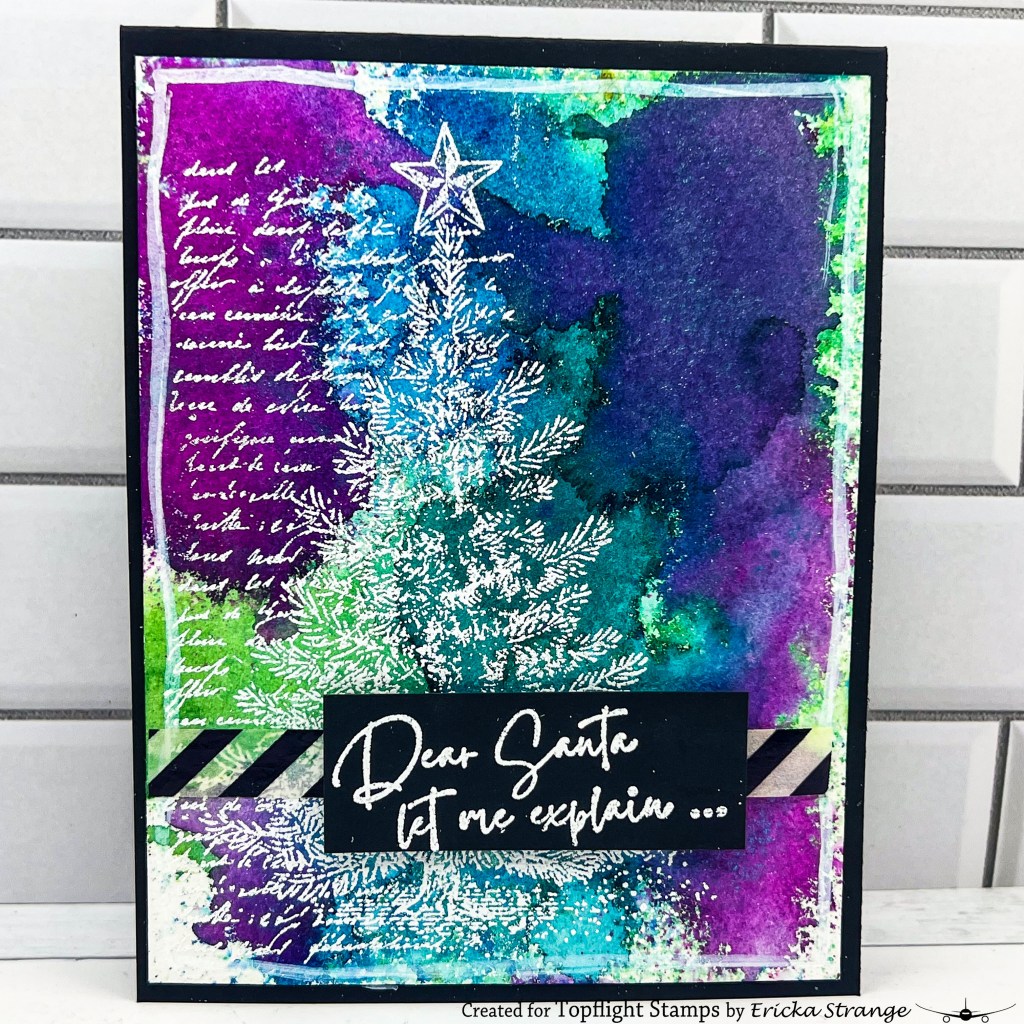 Once the background was completely dry, I stamped the PaperArtsy Xmas stamp and white heat-embossed it. I love how the scripty text peeks through behind the tree and gives it a beautiful layered effect that’s still clean and simple.