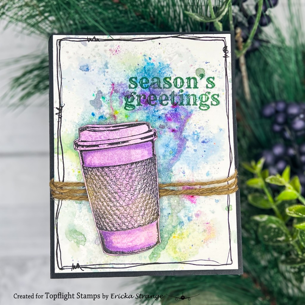 Using a piece of watercolor paper, I “cleaned up” my craft mat by pressing the paper into the overspray. I repeated the process, drying each layer before adding the next, until I had a dreamy, layered background full of rich holiday hues. Once it was dry, I stamped my coffee image on a separate paper sprayed with the same Lindy’s color. I added the festive sentiment, a little twine, and a hand drawn frame to complete the look.