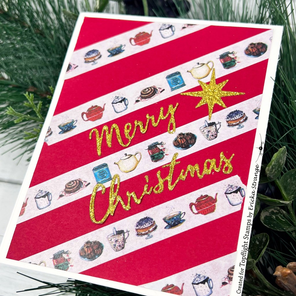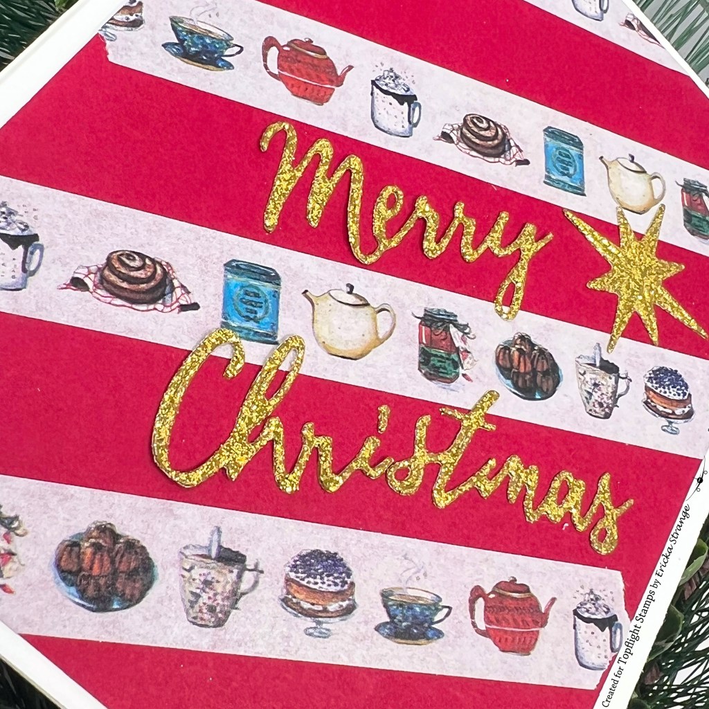 To build the card, I lined the washi across a piece of red cardstock, keeping the pattern tight and clean. Once the panel was covered, I die cut the Season’s Cheer sentiment from glittery gold cardstock and adhered it right on top. It’s simple, bright, and definitely delivers that Christmas sparkle.