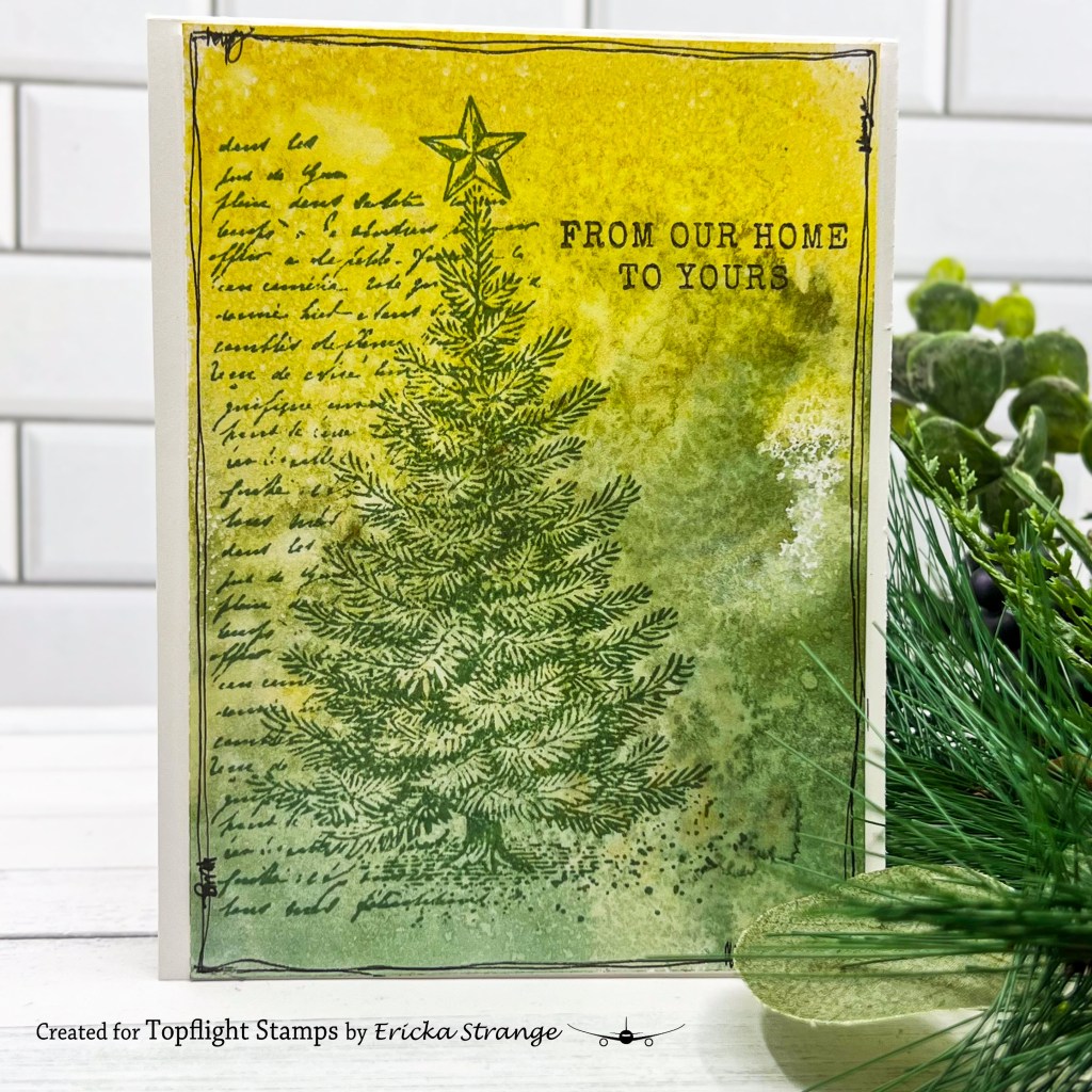 After pulling my print, I reached for the PaperArtsy Xmas 11 stamp set. The tree is stamped in Versafine Clair Rain Forest, which gives a bold, crisp image against the soft background. To complete the card, I added a simple hand-drawn frame and the sentiment included in the set. The pairing creates a rustic, old-fashioned look that feels right at home for the season.