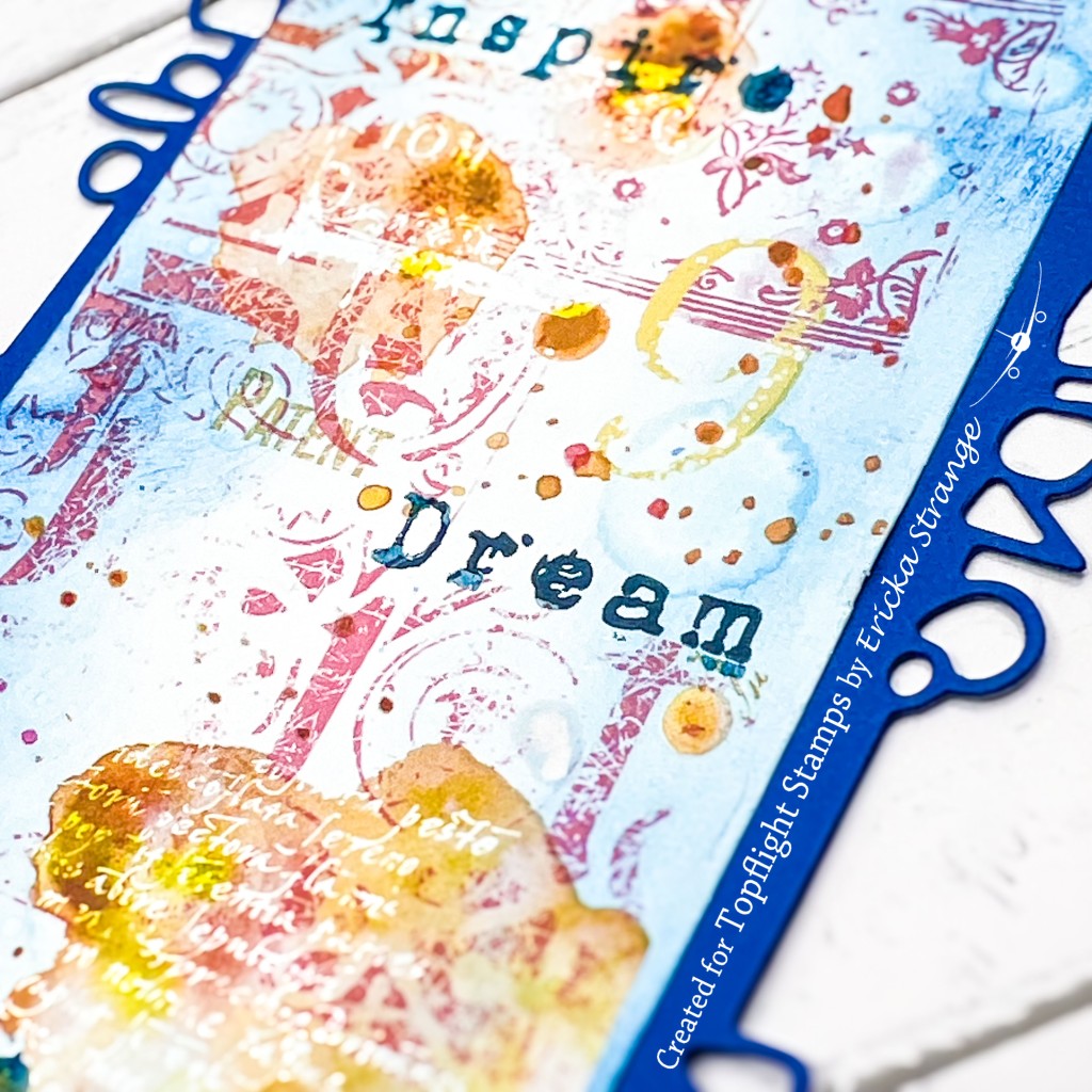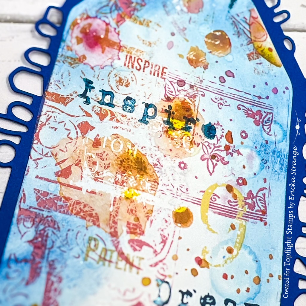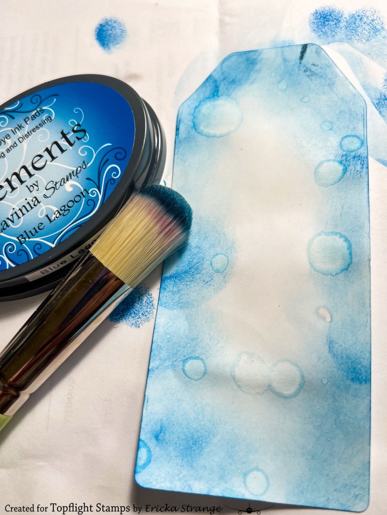 Next, I took the white portion of my tag and blended Lavinia Elements Dye Ink in Blue Lagoon over it. This dye ink is perfect for creating rich, vibrant backgrounds. After blending, I lightly spritzed the tag with water to lift some of the ink off the paper, creating a beautiful, mottled effect. This technique adds depth and texture to the tag.