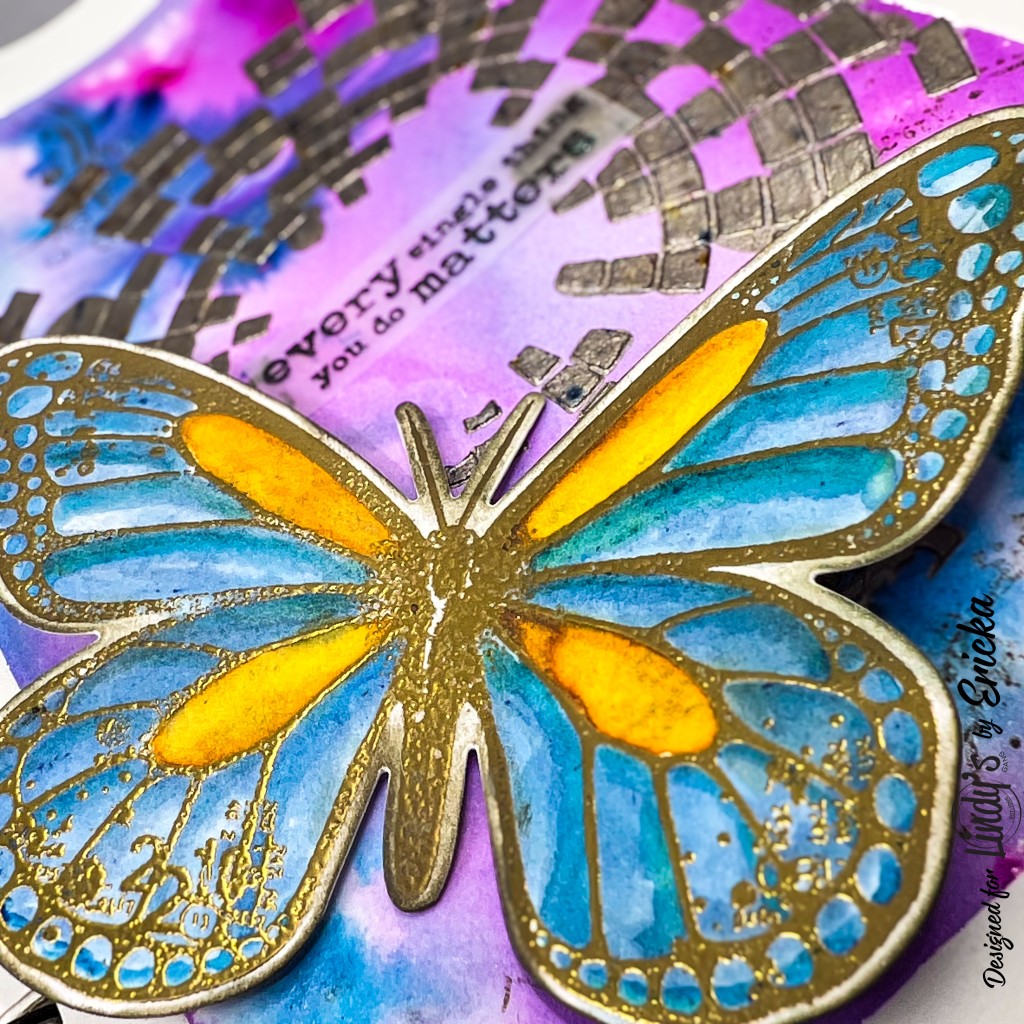 To bring the butterfly to life, I painted it with Apothecary Azul and Yesteryear Yellow, then grunged up the edges with a bit of Portobello ink for that well-worn, vintage feel. I also stamped and clear-embossed a sentiment on vellum, adding a delicate, ethereal touch to the background.