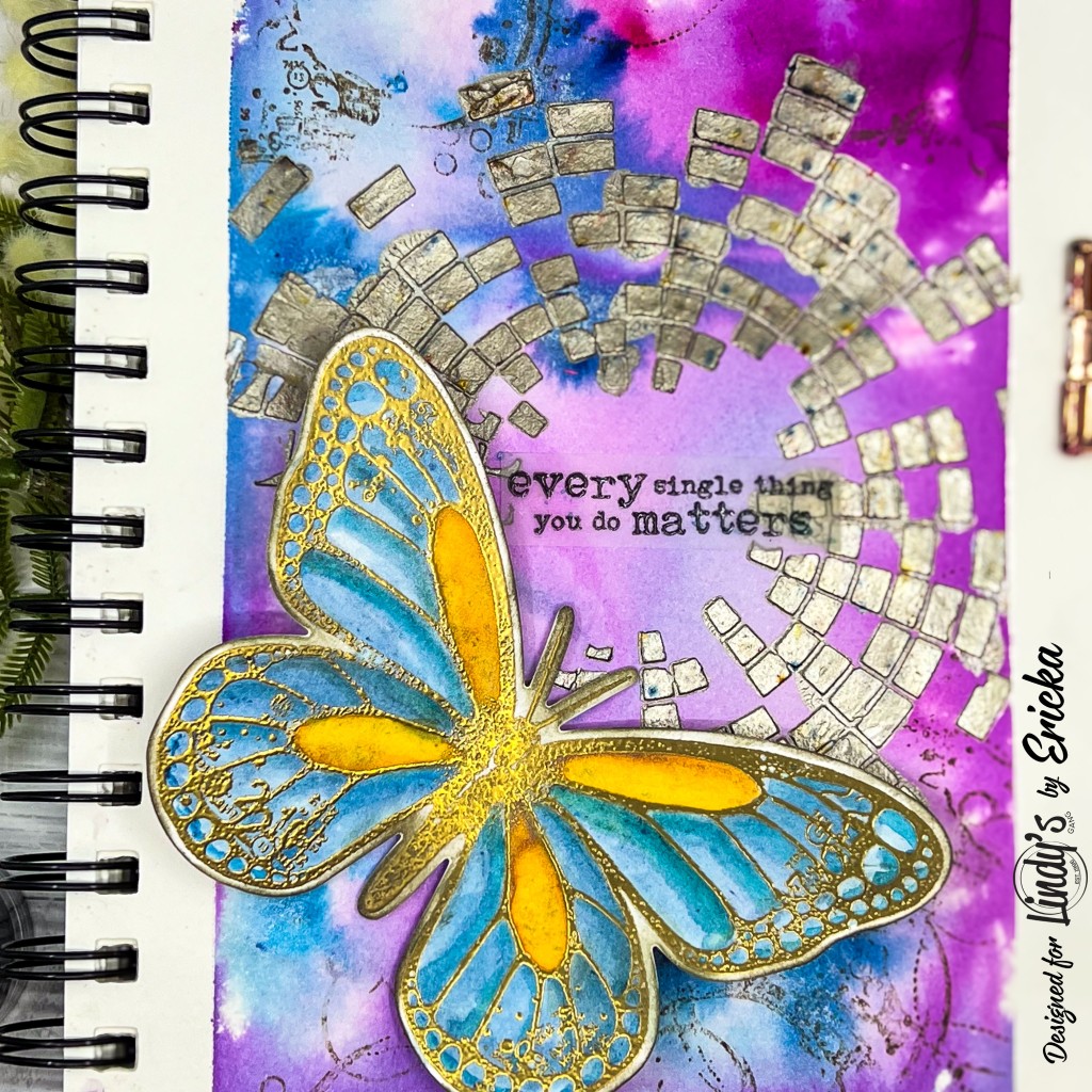 For the finishing touches, I added some background stamping in Portobello ink and attached the butterfly with foam tape to give it dimension. I’m thrilled with how this page turned out, and I hope it inspires you to join us in this exciting challenge!