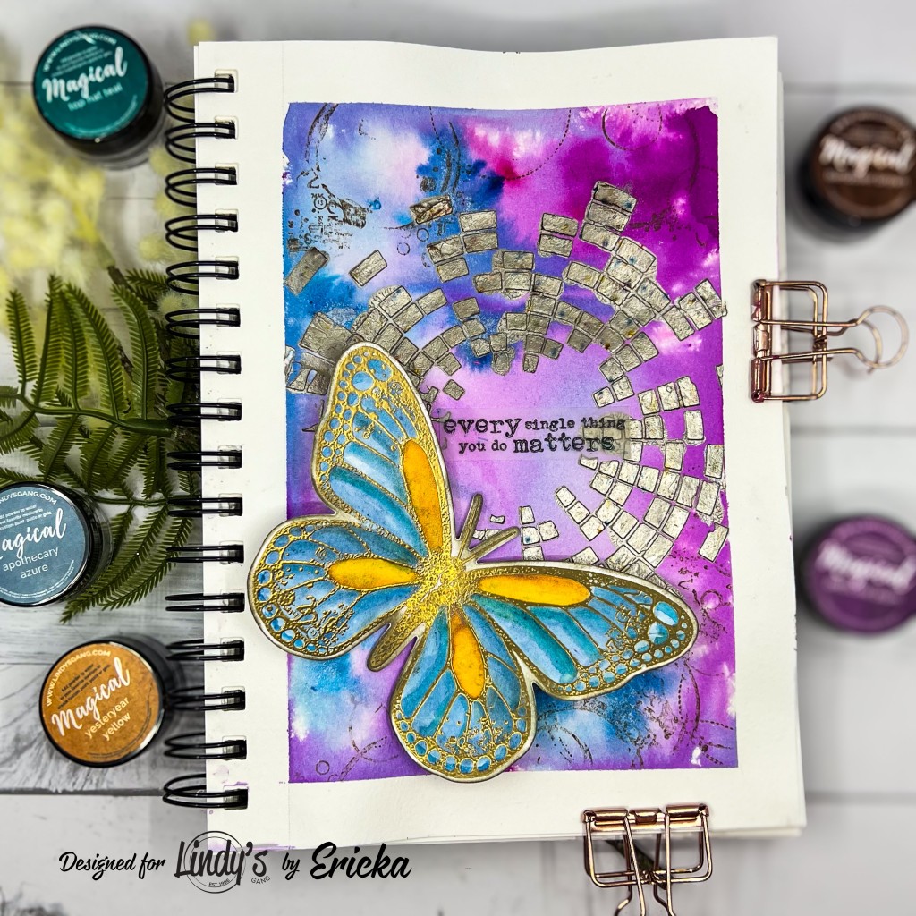 Once my background was dry, I added some texture with Bondoliero Brown, using Ranger Metallic Paste through the Visible Image Breakout Stencil. The metallic paste brought a shiny, metal-like finish to the page, perfectly complementing the steampunk theme. While the paste was setting, I stamped and heat embossed the Visible Image Butterfly Effect using Lindy’s Gang Gimme Five Gold.