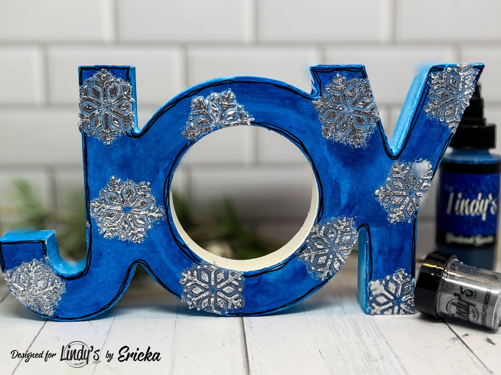 Hello gang, I can’t believe it is December. We’ve been getting out all the Christmas items and decorating and I came across a fun Joy sign that need some more sparkle. I sat down and knew that my Lindy’s products could do just the thing!