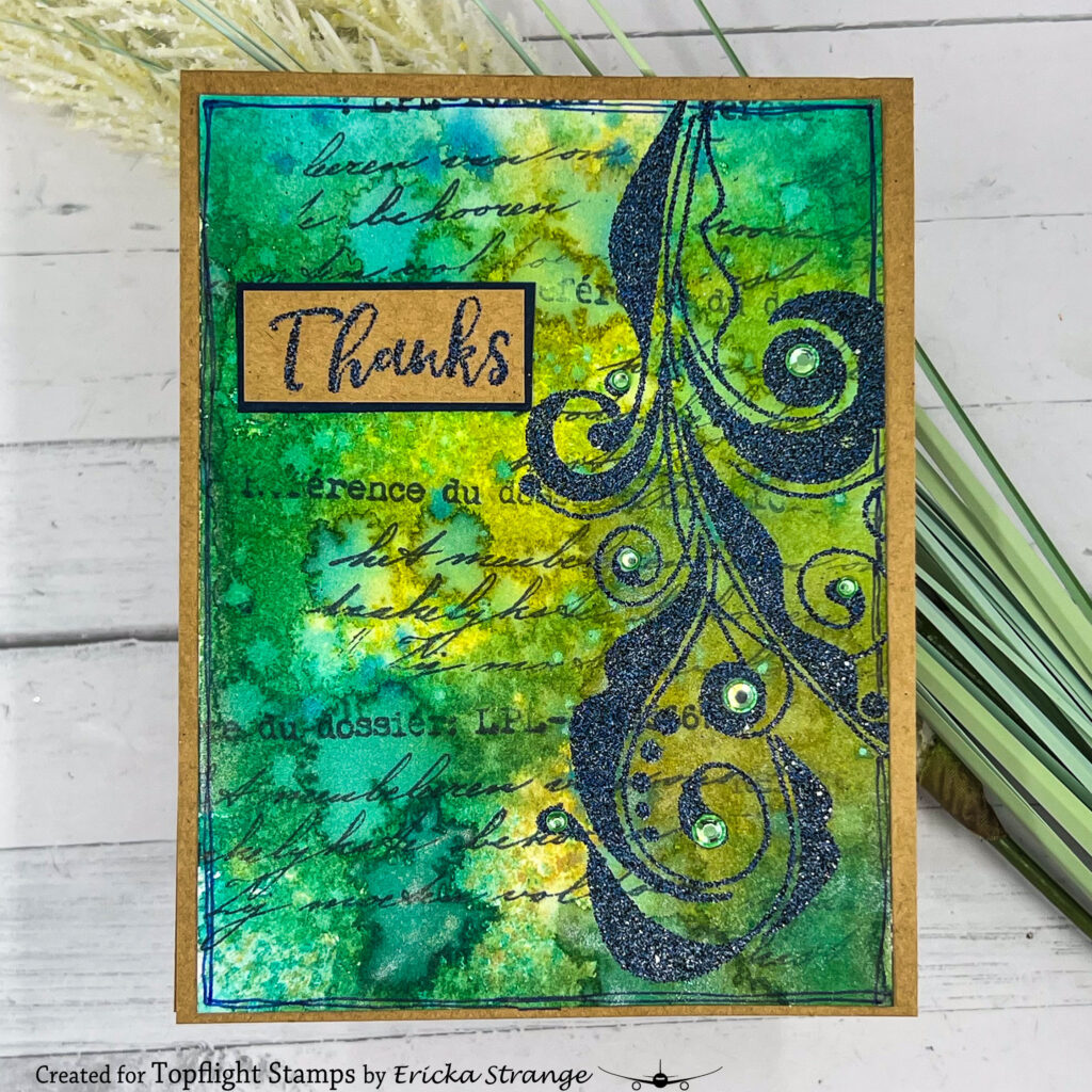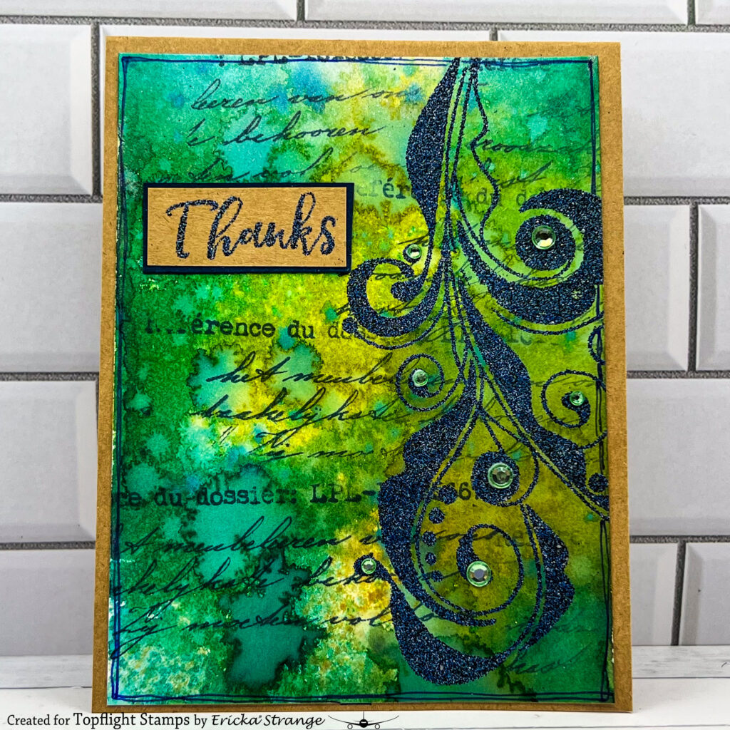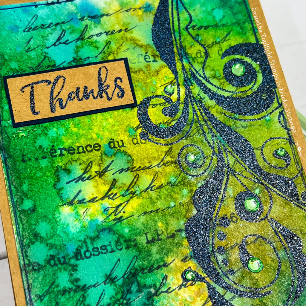 To add depth, I stamped over the panel using the Sara Naumann 51 with Versafine Clair Twilight. This subtle stamping helps break up the background and adds visual interest.