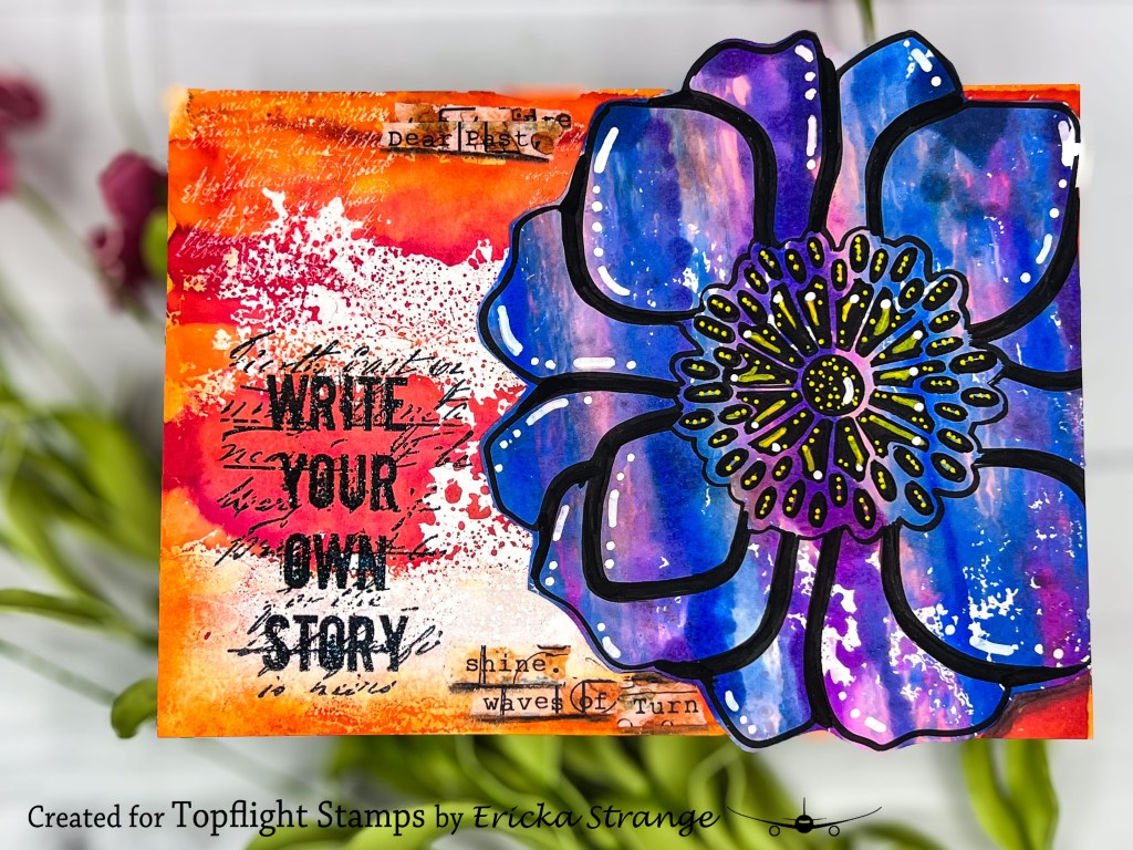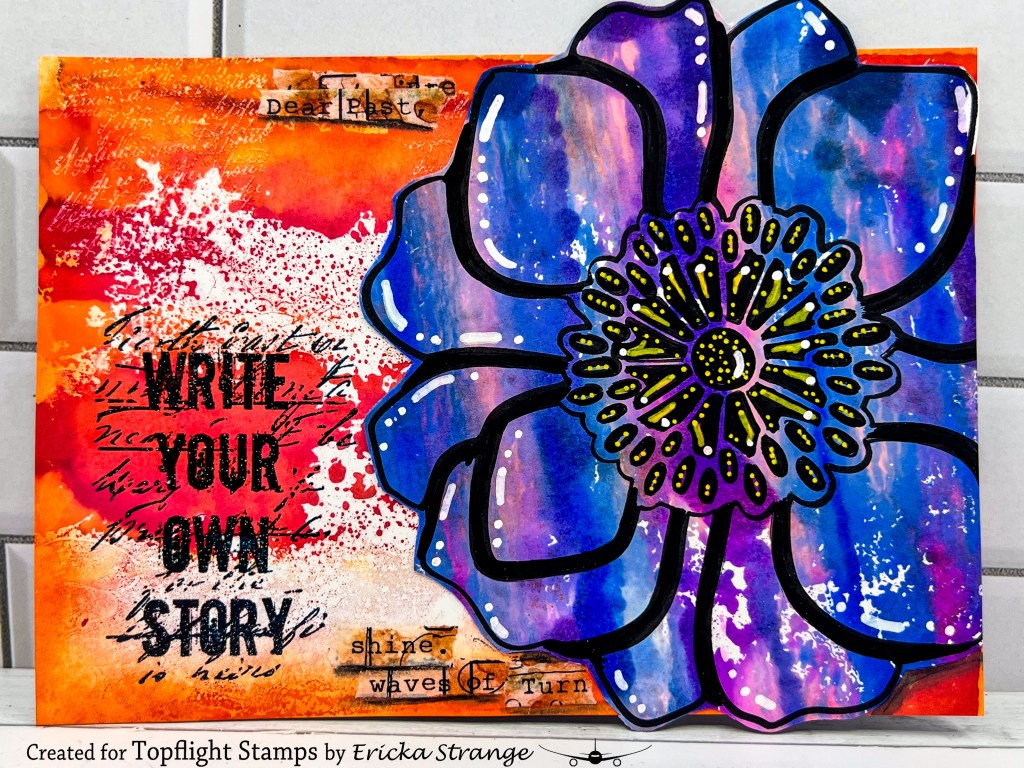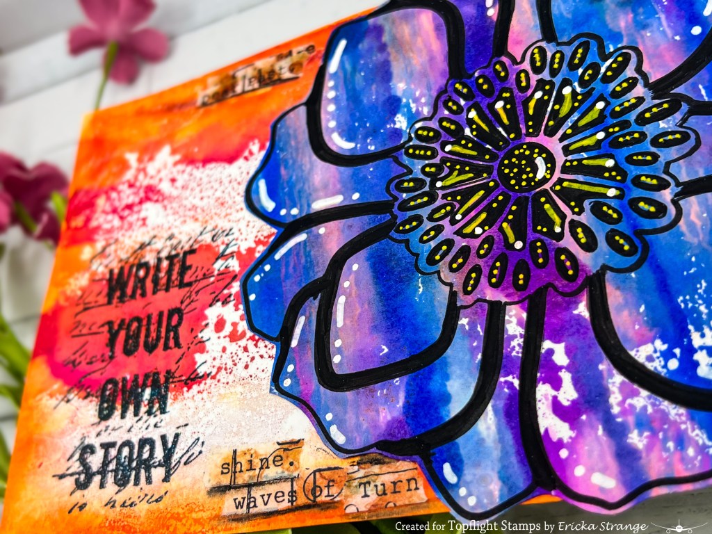 I began with a cool blue background and used the PaperArtsy Tracy Scott PS463 stencil to trace a big bloom using an acrylic pen. Once outlined, I added black shading and detailed it with yellow and white highlights. Then I cut it out to layer later.