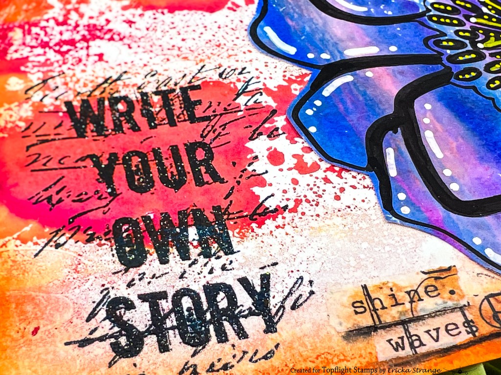 On my orange background, I stamped the Seth Apter Mini 65 sentiment using Versafine Twilight ink. I added background texture using the script stamp from Seth Apter 44 (PaperArtsy) in white ink, then clear heat embossed both stamps for texture and subtle shine.