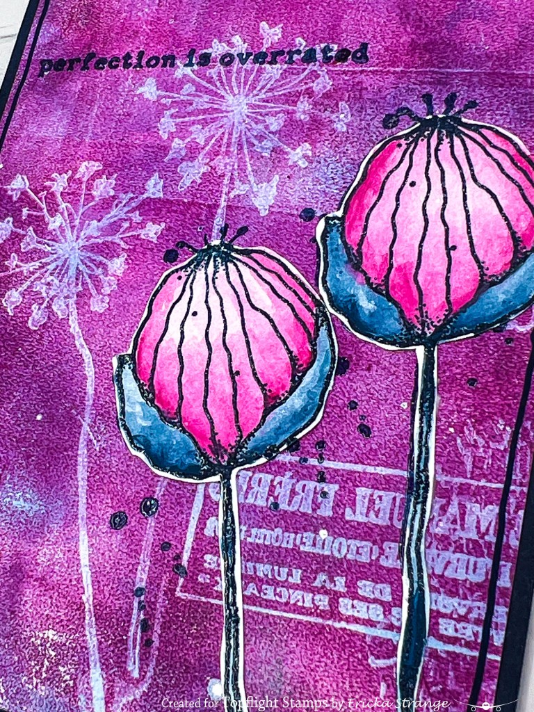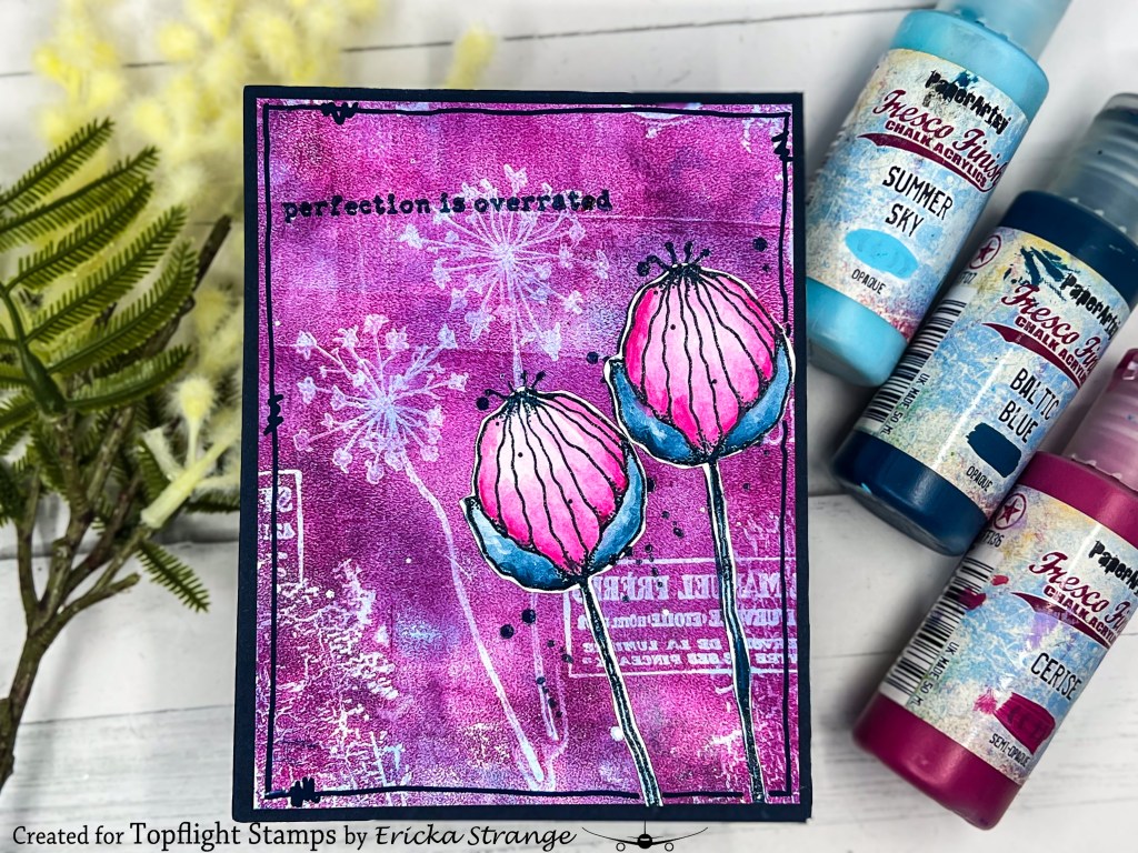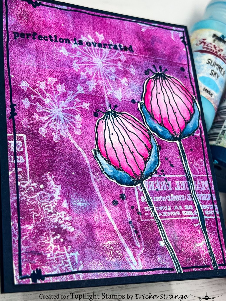To build my focal point, I stamped the whimsical flower from the PaperArtsy Kate Crane 011 set onto a separate sheet using Versafine Clair ink in Twilight, then clear embossed it for that extra pop. Using a water brush, I tinted it lightly with Cerise and Baltic Blue Fresco Paints, keeping it loose and dreamy.