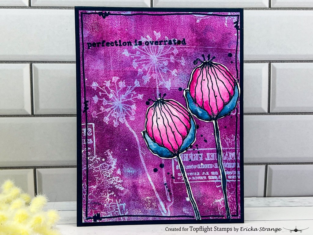 After fussy-cutting the flowers, I added them to my gel-printed background with a bit of dimension. For the finishing touch, I stamped a sentiment from the Kate Crane set and hand-sketched a border around the edge to tie it all together.