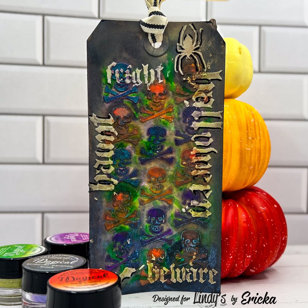To wrap it all up, I couldn’t resist using more texture paste with the Halloween Script stencil. The layered script added the final haunted touch, making the whole tag feel like a piece straight from a spellbook!